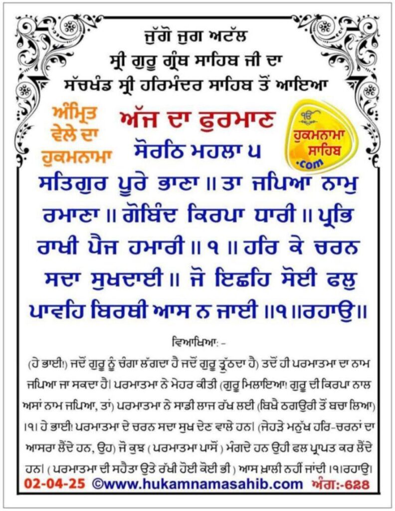 ਬੁੱਧਵਾਰ, ੨੦ ਚੇਤ (ਸੰਮਤ ੫੫੭ ਨਾਨਕਸ਼ਾਹੀ) 02-04-2025