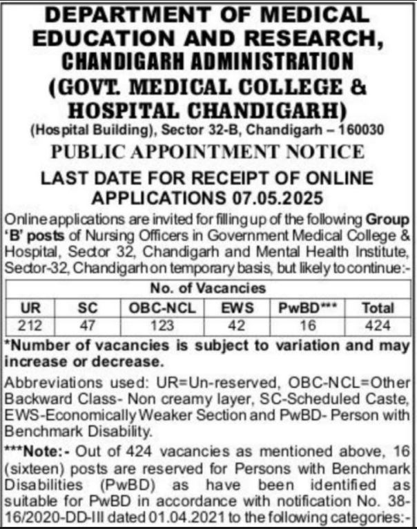 ਸਰਕਾਰੀ ਨੌਕਰੀ ਦੀ ਉਡੀਕ ਕਰ ਰਹੇ ਨੌਜਵਾਨਾਂ ਲਈ ਇਹ ਚੰਗੀ ਖਬਰ ਹੈ ਕਿ ਚੰਡੀਗੜ੍ਹ ਵਿੱਚ 424 ਅਸਾਮੀਆਂ ਨਿਕਲੀਆਂ ਹਨ। ਸਰਕਾਰੀ ਮੈਡੀਕਲ ਕਾਲਜ ਹਸਪਤਾਲ ਸੈਕਟਰ 32 ਵਿੱਚ ਨਰਸਿੰਗ ਸਟਾਫ ਲਈ ਅਰਜ਼ੀਆਂ ਦੀ ਮੰਗ ਕੀਤੀ ਗਈ ਹੈ। ਯੋਗ ਉਮੀਦਵਾਰ 7 ਮਈ ਤੱਕ ਆਨਲਾਈਨ ਇਨ੍ਹਾਂ ਅਸਾਮੀਆਂ ਲਈ ਅਪਲਾਈ ਕਰ ਸਕਦੇ ਹਨ।