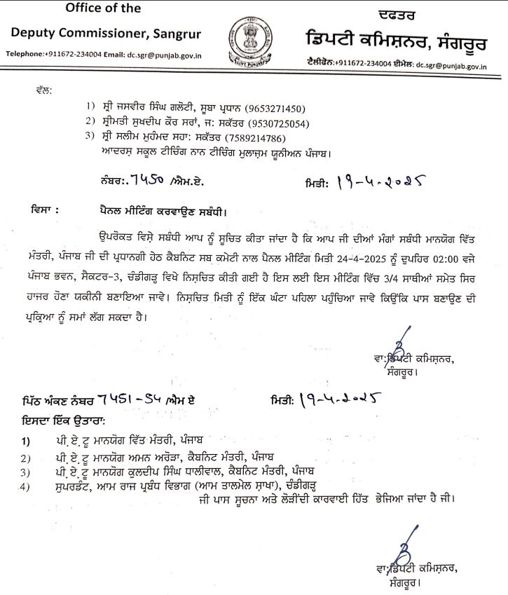 ਮੰਗਾਂ ਨੂੰ ਲੈ ਕੇ ਅਧਿਆਪਕ ਅਤੇ ਨਾਨ ਟੀਚਿੰਗ ਮੁਲਾਜ਼ਮਾਂ ਦੀ ਪੰਜਾਬ ਕੈਬਨਿਟ ਸਬ ਕਮੇਟੀ ਨਾਲ ਪੈਨਲ ਮੀਟਿੰਗ ਤੈਅ ਹੋਈ ਹੈ। ਮੀਟਿੰਗ ਸਬੰਧੀ ਡਿਪਟੀ ਕਮਿਸ਼ਨਰ ਸੰਗਰੂਰ ਵੱਲੋਂ ਪੱਤਰ ਜਾਰੀ ਕੀਤਾ ਗਿਆ ਹੈ। ਆਦਰਸ਼ ਸਕੂਲ ਟੀਚਿੰਗ ਨਾਲ ਟੀਚਿੰਗ ਮੁਲਾਜ਼ਮ ਯੂਨੀਅਨ ਪੰਜਾਬ ਨਾਲ 24 ਅਪ੍ਰੈਲ 2025 ਨੂੰ ਦੁਪਹਿਰ 2 ਵਜੇ ਪੰਜਾਬ ਭਵਨ ਸੈਕਟਰ ਚੰਡੀਗੜ੍ਹ ਵਿਖੇ ਹੋਵੇਗੀ।