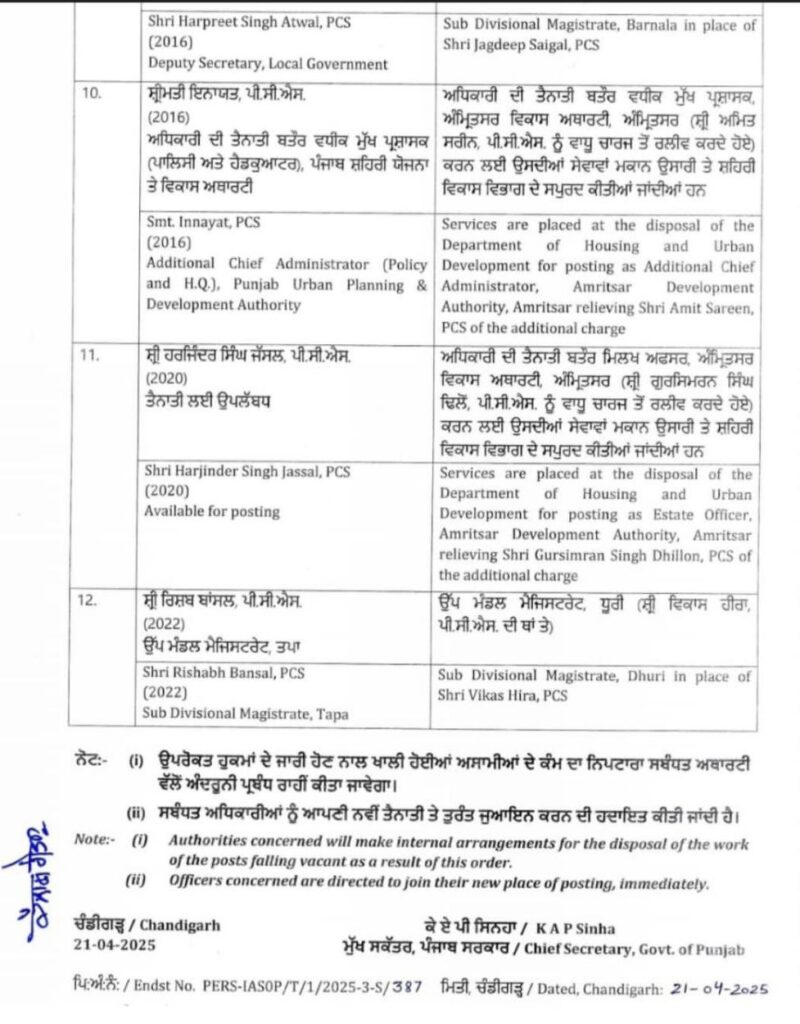 ਪੰਜਾਬ ਸਰਕਾਰ ਵੱਲੋਂ IAS ਅਤੇ PCS ਅਧਿਕਾਰੀਆਂ ਦੀਆਂ ਬਦਲੀਆਂ ਪੰਜਾਬ ਅਪ੍ਰੈਲ 21, 2025ਅਪ੍ਰੈਲ 22, 2025Leave a Comment on ਪੰਜਾਬ ਸਰਕਾਰ ਵੱਲੋਂ IAS ਅਤੇ PCS ਅਧਿਕਾਰੀਆਂ ਦੀਆਂ ਬਦਲੀਆਂ ਚੰਡੀਗੜ੍ਹ, 21 ਅਪ੍ਰੈਲ, ਦੇਸ਼ ਕਲਿੱਕ ਬਿਓਰੋ : ਪੰਜਾਬ ਸਰਕਾਰ ਵੱਲੋਂ IAS ਅਤੇ PCS ਅਧਿਕਾਰੀਆਂ ਦੀਆਂ ਬਦਲੀਆਂ (IAS PCS Transfers) ਕੀਤੀਆਂ ਗਈਆਂ ਹਨ। ਇਹ ਤੁਰੰਤ ਪ੍ਰਭਾਵ ਨਾਲ ਲਾਗੂ ਕਰਦੇ ਹੋਏ ਜੁਆਇਨ ਕਰਨ ਲਈ ਕਿਹਾ ਗਿਆ ਹੈ।