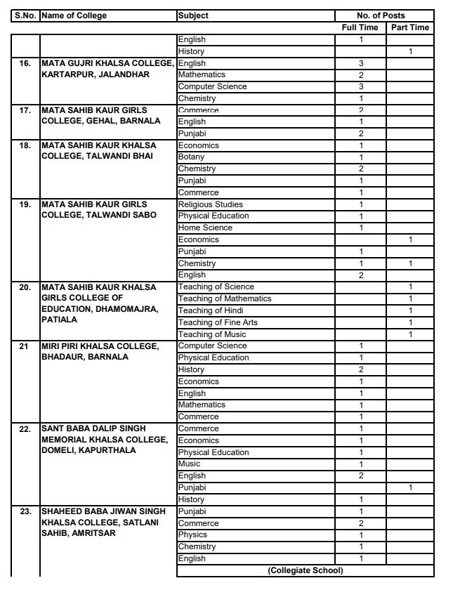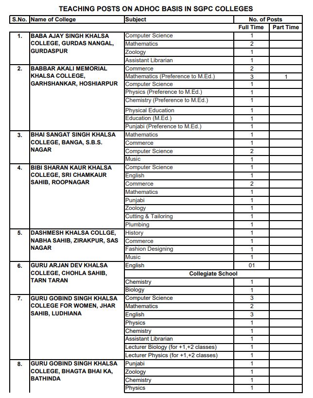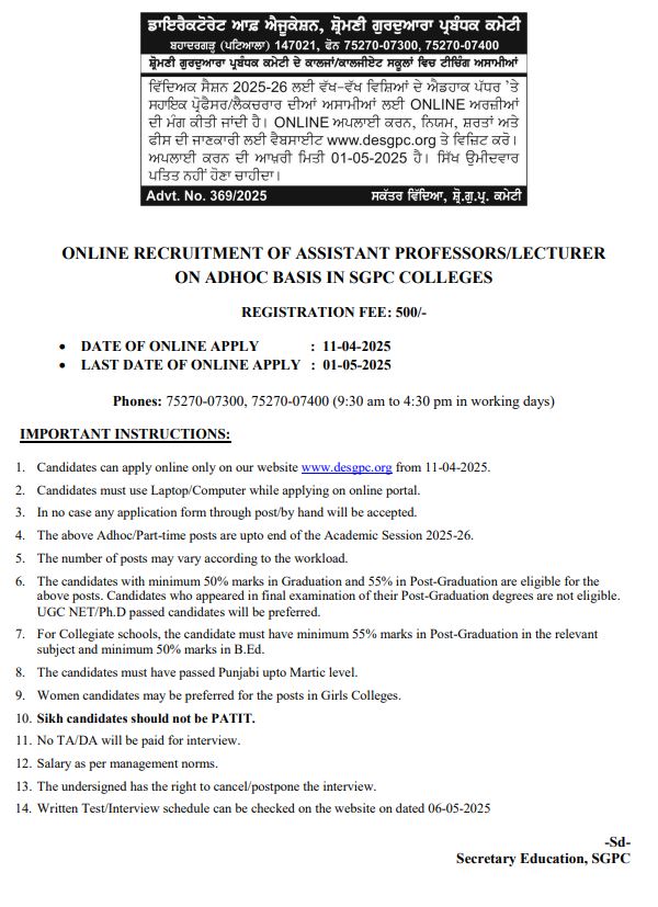 ਸਿੱਖਿਆ ਖੇਤਰ ਵਿੱਚ ਅਧਿਆਪਕ ਵਜੋਂ ਨੌਕਰੀ ਕਰਨ ਦੇ ਚਾਹਵਾਨਾਂ ਲਈ ਇਹ ਚੰਗੀ ਖਬਰ ਹੈ ਕਿ ਪੰਜਾਬ ਵਿੱਚ ਲੈਕਚਰਾਰਾਂ ਅਤੇ ਪ੍ਰੋਫੈਸਰਾਂ ਦੀਆਂ ਅਸਾਮੀਆਂ ਨਿਕਲੀਆਂ ਹਨ। ਪ੍ਰੋਫੈਸਰਾਂ ਅਤੇ ਲੈਕਚਰਾਰ ਦੀਆਂ ਅਸਾਮੀਆਂ ਲਈ ਅਰਜ਼ੀਆਂ ਦੀ ਮੰਗ ਕੀਤੀ ਗਈ ਹੈ। ਸ਼੍ਰੋਮਣੀ ਗੁਰਦੁਆਰਾ ਪ੍ਰਬੰਧਕ ਕਮੇਟੀ ਦੇ ਅਦਾਰਿਆਂ ਵਿੱਚ ਵੱਖ ਵੱਖ ਵਿਸ਼ਿਆਂ ਲਈ 315 ਅਸਾਮੀਆਂ ਕੱਢੀਆਂ ਗਈਆਂ ਹਨ। ਡਾਇਰੈਕਟੋਰੇਟ ਆਫ਼ ਐਜੂਕੇਸ਼ਨ, ਸ਼੍ਰੋਮਣੀ ਗੁਰਦੁਆਰਾ ਪ੍ਰਬੰਧਕ ਕਮੇਟੀ ਵੱਲੋਂ ਇਨ੍ਹਾਂ ਅਸਾਮੀਆਂ ਲਈ ਅਰਜ਼ੀਆਂ ਦੀ ਮੰਗ ਕੀਤੀ ਗਈ ਹੈ। ਯੋਗ ਉਮੀਦਵਾਰ 1 ਮਈ 2025 ਤੱਕ ਅਰਜ਼ੀਆਂ ਭੇਜ ਸਕਦੇ ਹਨ।