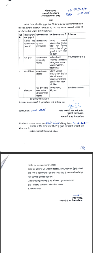 ਪੰਜਾਬ ਸਰਕਾਰ ਵੱਲੋਂ ਆਬਕਾਰੀ ਤੇ ਕਰ ਵਿਭਾਗ ‘ਚ ਬਦਲੀਆਂ ਪੰਜਾਬ ਮਈ 1, 2025ਮਈ 1, 2025Leave a Comment on ਪੰਜਾਬ ਸਰਕਾਰ ਵੱਲੋਂ ਆਬਕਾਰੀ ਤੇ ਕਰ ਵਿਭਾਗ ‘ਚ ਬਦਲੀਆਂ ਚੰਡੀਗੜ੍ਹ: 1 ਮਈ,ਦੇਸ਼ ਕਲਿੱਕ ਬਿਓਰੋਪੰਜਾਬ ਸਰਕਾਰ ਵੱਲੋਂ ਆਬਕਾਰੀ ਤੇ ਕਰ ਵਿਭਾਗ ਵਿੱਚ ਆਬਕਾਰੀ ਅਫਸਰਾਂ ਅਤੇ ਸਹਾਇਕ ਕਮਿਸ਼ਨਰਾਂ ਤਬਾਦਲੇ ਕੀਤੇ ਗਏ ਹਨ। ਜਿਸ ਦੀ ਸੂਚੀ ਜਾਰੀ ਕਰ ਦਿੱਤੀ ਗਈ ਹੈ।