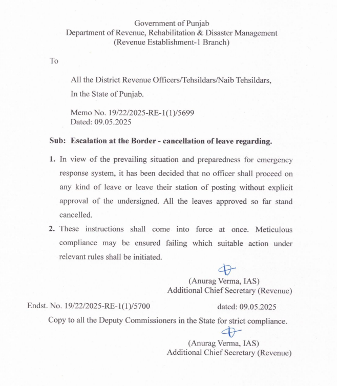 ਭਾਰਤ ਅਤੇ ਪਾਕਿਸਤਾਨ ਵਿੱਚ ਵੱਧਦੇ ਤਣਾਅ ਕਾਰਨ ਪੰਜਾਬ ਸਰਕਾਰ ਵੱਲੋਂ ਕਰਮਚਾਰੀਆਂ ਦੀਆਂ ਛੁੱਟੀਆਂ ਰੱਦ ਕਰ ਦਿੱਤੀਆਂ ਗਈਆਂ ਹਨ। ਸਰਕਾਰ ਵੱਲੋਂ ਜਾਰੀ ਪੱਤਰ ਅਨੁਸਾਰ ਪੰਜਾਬ ਦੇ ਤਹਿਸੀਲਦਾਰਾਂ , ਨਾਇਬ ਤਹਿਸੀਲਦਾਰਾਂ ਅਤੇ ਪਟਵਾਰੀਆਂ ਦੀਆਂ ਛੁੱਟੀਆਂ ਰੱਦ ਕਰ ਦਿੱਤੀਆਂ ਗਈਆਂ ਹਨ।