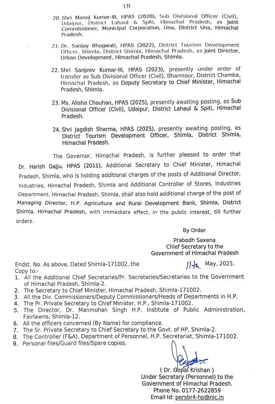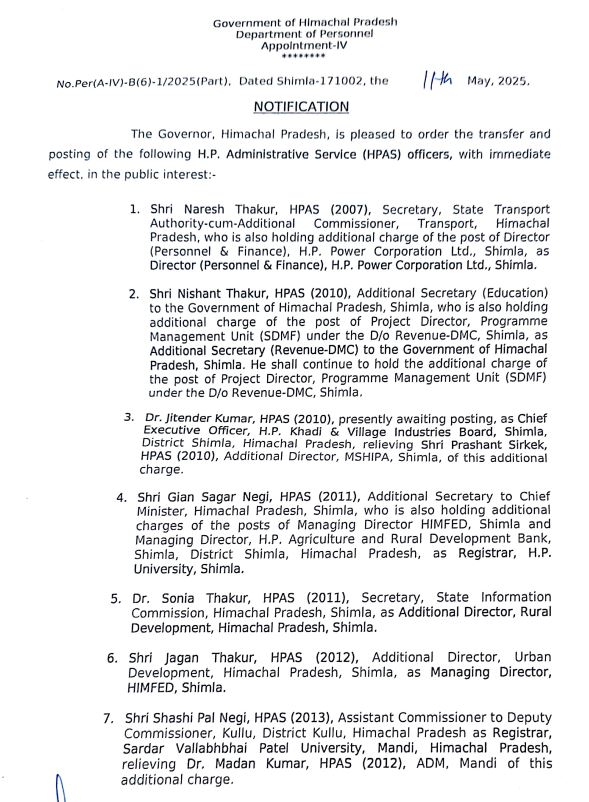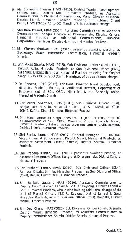 ਸਰਕਾਰ ਵੱਲੋਂ ਐਚਪੀਏਐਸ ਅਧਿਕਾਰੀਆਂ ਦੀਆਂ ਬਦਲੀਆਂ ਕੀਤੀਆਂ ਗਈਆਂ ਹਨ। ਇਹ ਬਦਲੀਆਂ ਤੁਰੰਤ ਪ੍ਰਭਾਵ ਨਾਲ ਲਾਗੂ ਹੋ ਗਈਆਂ।