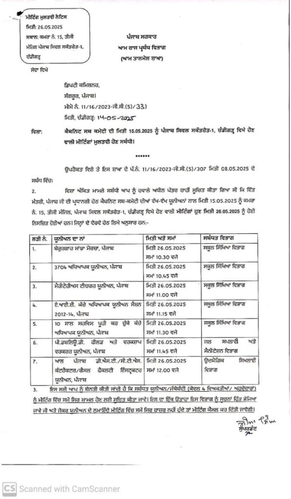 ਕੈਬਨਿਟ ਸਬ ਕਮੇਟੀ ਨਾਲ ਅਧਿਆਪਕ ਜਥੇਬੰਦੀਆਂ ਤੇ ਹੋਰਨਾਂ ਯੂਨੀਅਨਾਂ ਦੀ 15 ਮਈ 2025 ਨੂੰ ਹੋਣ ਵਾਲੀ ਮੀਟਿੰਗ ਮੁਲਤਵੀ ਕਰ ਦਿੱਤੀ ਗਈ ਹੈ। ਇਸ ਮੀਟਿੰਗ ਸਬੰਧੀ ਅਗਲੀ ਮਿਤੀ ਦਿੱਤੀ ਗਈ ਹੈ। ਇਹ ਮੀਟਿੰਗ ਹੁਣ 26 ਮਈ ਨੂੰ ਹੋਵੇਗੀ।