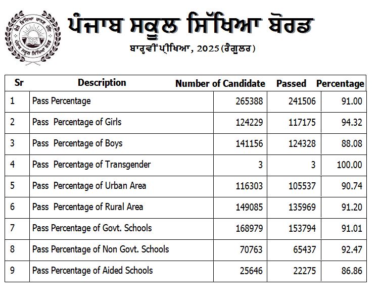 ਪੰਜਾਬ ਸਕੂਲ ਸਿੱਖਿਆ ਬੋਰਡ ਵੱਲੋਂ ਅੱਜ 12ਵੀਂ ਕਲਾਸ ਦਾ ਨਤੀਜਾ ਐਲਾਨ ਦਿੱਤਾ ਗਿਆ ਹੈ। 12ਵੀਂ ਕਲਾਸ ਦਾ ਨਤੀਜਾ 91 ਫੀਸਦੀ ਰਿਹਾ। ਇਸ ਵਾਰ 265388 ਵਿਦਿਆਰਥੀਆਂ ਨੇ ਪੇਪਰ ਦਿੱਤੇ ਜਿਸ ਵਿਚੋਂ 241506 ਵਿਦਿਆਰਥੀ ਪਾਸ ਹੋਏ ਤੇ ਨਤੀਜਾ 91 ਫੀਸਦੀ ਰਿਹਾ। ਐਲਾਨੇ ਨਤੀਜੇ ਵਿੱਚ ਕੁੜੀਆਂ ਨੇ ਮੁੰਡਿਆਂ ਨੂੰ ਪਿੱਛੇ ਛੱਡ ਦਿੱਤਾ ਕੁੜੀਆਂ ਦੀ ਪਾਸ ਫੀਸਦੀ 94.32 ਰਹੀ ਜਦੋਂ ਕਿ ਮੁੰਡੇ 88.08 ਫੀਸਦੀ ਪਾਸ ਹੋਏ।
