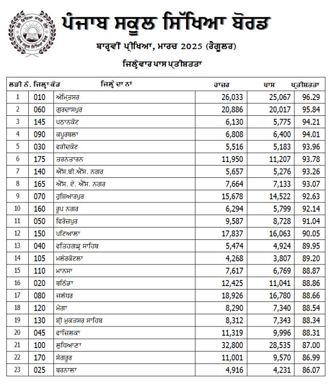 ਐਲਾਨੇ ਗਏ ਨਤੀਜੇ ਵਿੱਚ ਅੰਮ੍ਰਿਤਸਰ ਜ਼ਿਲ੍ਹਾ ਮੋਹਰੀ ਰਿਹਾ। ਅੰਮ੍ਰਿਤਸਰ ਜ਼ਿਲ੍ਹੇ ਦੇ 96.29 ਫੀਸਦੀ ਵਿਦਿਆਰਥੀ ਪਾਸ ਹੋਏ। ਬਰਨਾਲਾ ਜ਼ਿਲ੍ਹਾ ਸਭ ਤੋਂ ਫਾਡੀ ਰਿਹਾ। ਬਰਨਾਲਾ ਜ਼ਿਲ੍ਹੇ ਦੀ ਪਾਸ ਪ੍ਰਤੀਸ਼ਤਾ 86.07 ਫੀਸਦੀ ਰਹੀ।