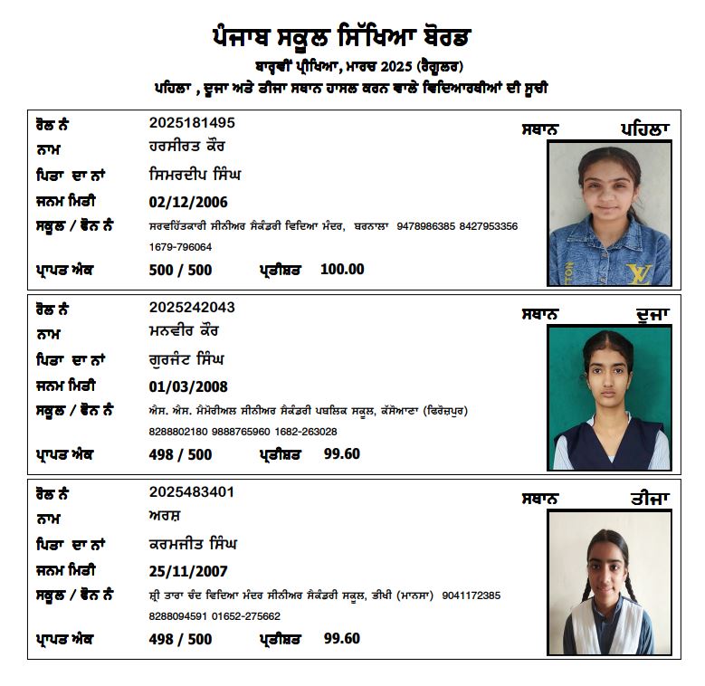 ਪਹਿਲੇ ਤਿੰਨੇ ਸਥਾਨਾਂ ਉਤੇ ਕੁੜੀਆਂ ਨੇ ਮਾਰੀ ਬਾਜ਼ੀ