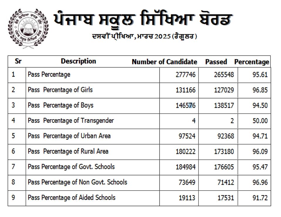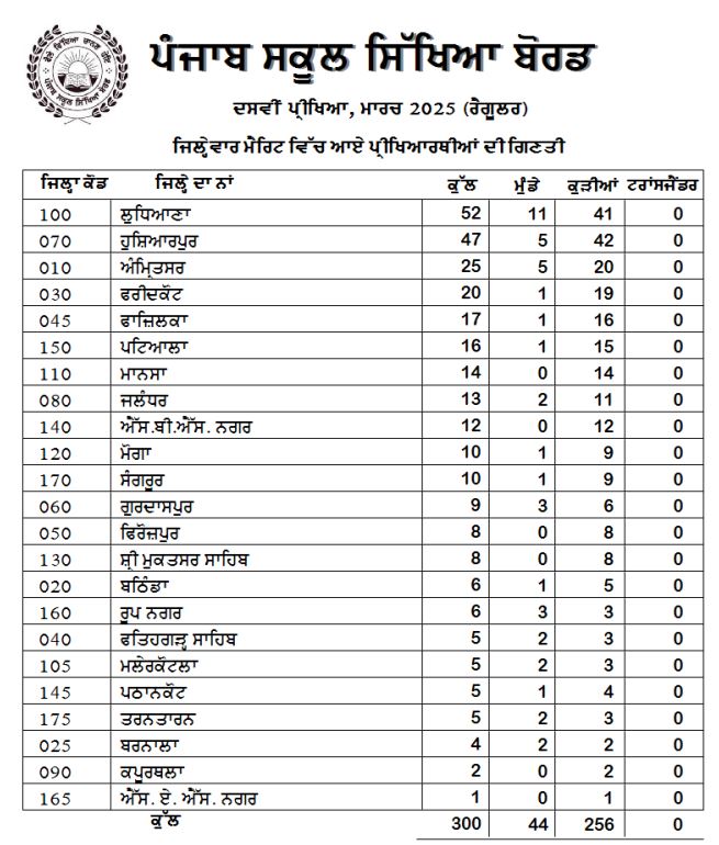 ਪੰਜਾਬ ਸਕੂਲ ਸਿੱਖਿਆ ਬੋਰਡ ਵੱਲੋਂ ਅੱਜ 10ਵੀਂ ਕਲਾਸ ਦਾ ਨਤੀਜਾ ਐਲਾਨ ਦਿੱਤਾ ਗਿਆ ਹੈ। ਸਿੱਖਿਆ ਬੋਰਡ ਵੱਲੋਂ ਐਲਾਨਿਆ ਨਤੀਜਾ 95.61 ਫੀਸਦੀ ਰਿਹਾ। 10ਵੀਂ ਕਲਾਸ ਦੇ ਰੈਗੁਲਰ 277746 ਵਿਦਿਆਰਥੀਆਂ ਨੇ ਪ੍ਰੀਖਿਆ ਦਿੱਤੀ ਸੀ, ਜਿਸ ਵਿਚੋਂ 265548 ਪਾਸ ਹੋਏ। ਨਤੀਜੇ ਵਿੱਚ ਲੜਕੀਆ ਮੋਹਰੀ ਰਹੀਆਂ। ਬੋਰਡ ਵੱਲੋਂ 300 ਵਿਦਿਆਰਥੀਆਂ ਦੀ ਮੈਰਿਟ ਸੂਚੀ ਜਾਰੀ ਕੀਤੀ ਗਈ। ਮੈਰਿਟ ਸੂਚੀ ਵਿੱਚ 256 ਲੜਕੀਆਂ ਨੇ ਸਥਾਨ ਪ੍ਰਾਪਤ ਕੀਤਾ ਜਦੋਂ ਕਿ ਮੁੰਡੇ ਸਿਰਫ 44 ਹੀ ਮੈਰਿਟ ਵਿੱਚ ਆਏ। ਲੁਧਿਆਣਾ ਜ਼ਿਲ੍ਹੇ ਦੇ ਸਪ ਤੋਂ ਜ਼ਿਆਦਾ 52 ਵਿਦਿਆਰਥੀ ਮੈਰਿਟ ਵਿੱਚ ਆਏ ਜਿਸ ਵਿਚੋਂ 11 ਮੁੰਡੇ ਅਤੇ 41 ਕੁੜੀਆਂ ਹਨ। ਸਭ ਤੋਂ ਘੱਟ ਮੋਹਾਲੀ ਜ਼ਿਲ੍ਹੇ ਦੇ ਮੈਰਿਟ ਵਿੱਚ ਆਏ ਸਿਰਫ ਇਕ ਲੜਕੀ।