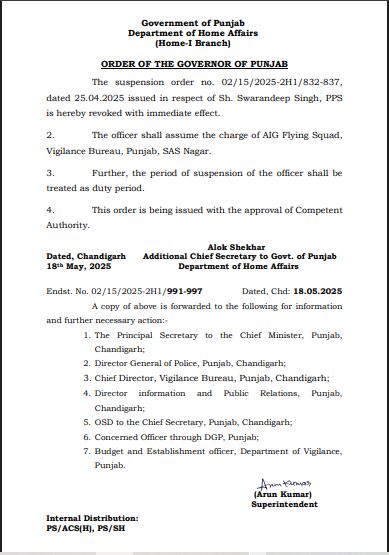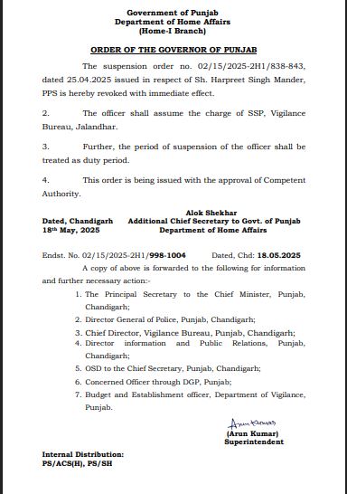 ਪੰਜਾਬ ਸਰਕਾਰ ਨੇ 2 ਪੁਲਿਸ ਅਧਿਕਾਰੀਆਂ ਦੇ ਮੁਅੰਤਲੀ ਹੁਕਮ ਰੱਦ ਕਰਦਿਆਂ ਉਨ੍ਹਾਂ ਨੂੰ ਤੁਰੰਤ ਡਿਊਟੀ ‘ਤੇ ਹਾਜ਼ਰ ਹੋਣ ਲਈ ਕਿਹਾ ਹੈ। PPS ਅਧਿਕਾਰੀ ਸਵਰਨਦੀਪ ਸਿੰਘ ,ਜਿਨ੍ਹਾਂ ਨੂੰ 25 ਅਪ੍ਰੈਲ 2025 ਨੂੰ ਮੁਅੱਤਲ ਕੀਤਾ ਗਿਆ ਸੀ, ਨੂੰ ਹੁਣ AIG ਫਲਾਈਂਗ ਸੁਕੈਅਡ ਵਿਜੀਲੈਂਸ ਬਿਓਰੋ ਪੰਜਾਬ ਐਸ ਏ ਐਸ ਨਗਰ ਲਾਇਆ ਗਿਆ ਹੈ ਅਤੇ PPS ਅਧਿਕਾਰੀ ਹਰਪ੍ਰੀਤ ਸਿੰਘ ਮੰਡੇਰ ਨੂੰ ਐਸ ਐਸ ਪੀ ਵਿਜੀਲੈਂਸ ਬਿਓਰੋ ਜਲੰਧਰ ਲਾਇਆ ਗਿਆ ਹੈ। ਸਰਕਾਰ ਵੱਲੋਂ ਜਾਰੀ ਪੱਤਰ ਅਨੁਸਾਰ ਇਨ੍ਹਾਂ ਅਧਿਕਾਰੀਆਂ ਦੀ ਮੁਅੱਤਲੀ ਦਾ ਸਮਾਂ ਡਿਊਟੀ ਪੀਰੀਅਡ ਸਮਝਿਆ ਜਾਵੇਗਾ।