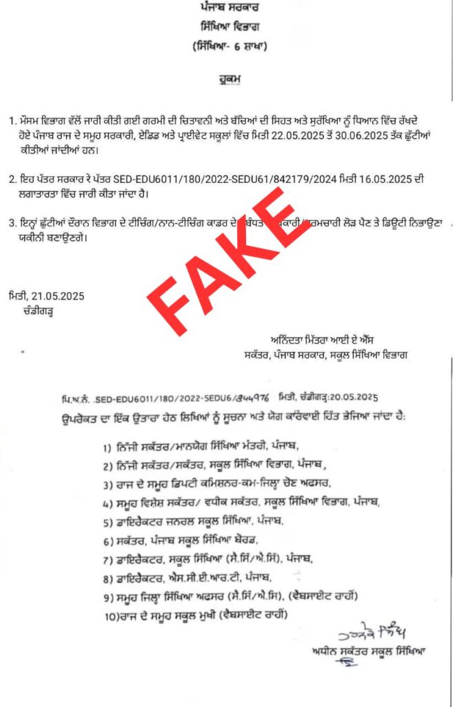 ਪੰਜਾਬ ਸਮੇਤ ਉਤਰ ਭਾਰਤ ਵਿੱਚ ਪੈ ਰਹੀ ਗਰਮੀ ਨੇ ਲੋਕਾਂ ਨੂੰ ਸਤਾਇਆ ਹੋਇਆ ਹੈ। ਹੁਣ ਪੰਜਾਬ ਵਿੱਚ ਸਕੂਲਾਂ ਵਿੱਚ ਛੁੱਟੀਆਂ ਨੂੰ ਲੈ ਕੇ ਇਕ ਪੱਤਰ ਸੋਸ਼ਲ ਮੀਡੀਆ ਉਤੇ ਵਾਇਰਲ ਹੋ ਰਿਹਾ ਹੈ। ਇਸ ਪੱਤਰ ਵਿੱਚ ਦਾਅਵਾ ਕੀਤਾ ਗਿਆ ਕਿ 22 ਮਈ ਤੋਂ 30 ਜੂਨ ਤੱਕ ਸਕੂਲਾਂ ਵਿੱਚ ਛੁੱਟੀਆਂ ਕਰ ਦਿੱਤੀਆਂ ਗਈਆਂ ਹਨ। ਜਦੋਂ ਇਸ ਪੱਤਰ ਸਬੰਧੀ ਵਿਭਾਗ ਦਾ ਕਹਿਣਾ ਹੈ ਕਿ ਇਹ ਪੱਤਰ ਫੇਕ ਹੈ। ਵਿਭਾਗ ਵੱਲੋਂ ਇਸ ਸਬੰਧੀ ਪੁਸ਼ਟੀ ਕੀਤੀ ਗਈ ਹੈ ਕਿ ਇਹ ਫੈਕ ਹੈ। ਇਸ ਉਤੇ ਵਿਸ਼ਵਾਸ ਨਾ ਕੀਤਾ ਜਾਵੇ।