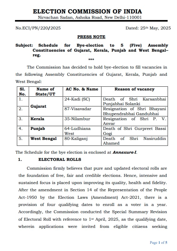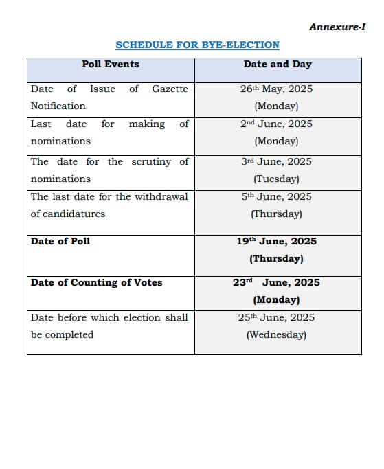 ਪੰਜਾਬ ਵਿੱਚ ਲੁਧਿਆਣਾ ਵਿੱਚ ਹੋਣ ਵਾਲੀ ਵਿਧਾਨ ਸਭਾ ਦੀ ਜ਼ਿਮਨੀ ਚੋਣ ਲਈ ਮਿਤੀ ਦਾ ਐਲਾਨ ਹੋ ਗਿਆ ਹੈ। ਦੇਸ਼ ਭਰ ਵਿੱਚ ਲੁਧਿਆਣਾ ਵੈਸਟ ਸਮੇਤ 5 ਥਾਵਾਂ ਉਤੇ ਜ਼ਿਮਨੀ ਚੋਣਾਂ ਹੋਣਗੀਆਂ। ਇਸ ਸਬੰਧੀ ਭਾਰਤ ਦੇ ਚੋਣ ਕਮਿਸ਼ਨਰ ਵੱਲੋਂ ਪ੍ਰੋਗਰਾਮ ਜਾਰੀ ਕਰ ਦਿੱਤਾ ਗਿਆ ਹੈ। ਲੁਧਿਆਣਾ ਦੀ ਜ਼ਿਮਨੀ ਚੋਣ ਲਈ 19 ਜੂਨ ਨੂੰ ਵੋਟਾਂ ਪੈਣਗੀਆਂ।