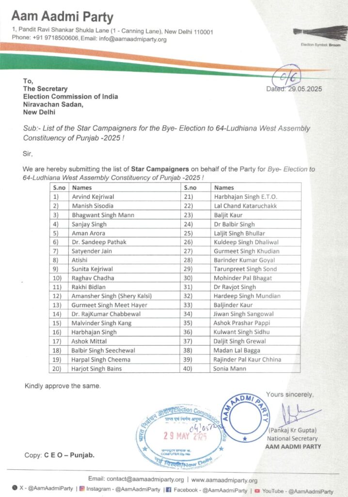ਲੁਧਿਆਣਾ ਜ਼ਿਮਨੀ ਚੋਣ : ‘ਆਪ’ ਵੱਲੋਂ ਸਟਾਰ ਪ੍ਰਚਾਰਕਾਂ ਦੀ ਲਿਸਟ ਜਾਰੀ