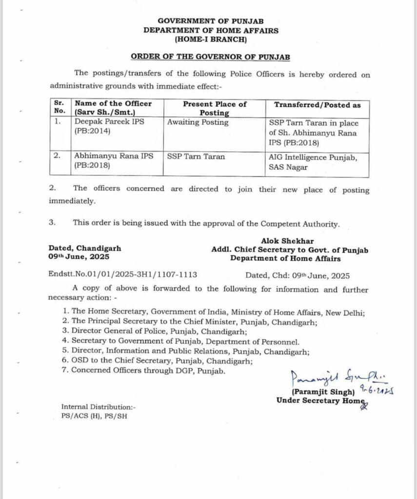 ਪੰਜਾਬ ਸਰਕਾਰ ਵੱਲੋਂ 1 SSP ਸਮੇਤ 2 IPS ਅਧਿਕਾਰੀਆਂ ਦੀਆਂ ਬਦਲੀਆਂ ਪੰਜਾਬ ਜੂਨ 9, 2025ਜੂਨ 9, 2025Leave a Comment on ਪੰਜਾਬ ਸਰਕਾਰ ਵੱਲੋਂ 1 SSP ਸਮੇਤ 2 IPS ਅਧਿਕਾਰੀਆਂ ਦੀਆਂ ਬਦਲੀਆਂ ਚੰਡੀਗੜ੍ਹ, 9 ਜੂਨ, ਦੇਸ਼ ਕਲਿੱਕ ਬਿਓਰੋ : ਪੰਜਾਬ ਸਰਕਾਰ ਵੱਲੋਂ 1 ਐਸਐਸਪੀ ਅਤੇ 2 ਆਈਪੀਐਸ ਅਧਿਕਾਰੀਆਂ ਦੀਆਂ ਬਦਲੀਆਂ ਕੀਤੀਆਂ ਗਈਆਂ ਹਨ। ਸਰਕਾਰ ਵੱਲੋਂ ਜਾਰੀ ਹੁਕਮਾਂ ਵਿੱਚ ਕਿਹਾ ਗਿਆ ਹੈ ਕਿ ਇਹ ਬਦਲੀਆਂ ਤੁਰੰਤ ਪ੍ਰਭਾਵ ਨਾਲ ਲਾਗੂ ਕੀਤੀਆਂ ਗਈਆਂ ਹਨ।