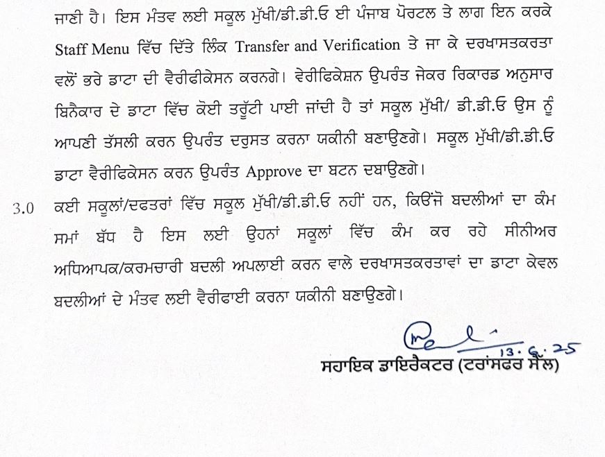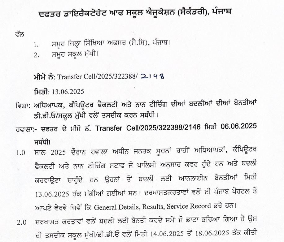 ਅਧਿਆਪਕਾਂ ਤੇ ਨਾਨ ਟੀਚਿੰਗ ਦੀਆਂ ਬਦਲੀਆਂ ਸਬੰਧੀ ਸਿੱਖਿਆ ਵਿਭਾਗ ਵੱਲੋਂ ਅਹਿਮ ਪੱਤਰ ਜਾਰੀ ਪੰਜਾਬ ਜੂਨ 13, 2025ਜੂਨ 13, 2025Leave a Comment on ਅਧਿਆਪਕਾਂ ਤੇ ਨਾਨ ਟੀਚਿੰਗ ਦੀਆਂ ਬਦਲੀਆਂ ਸਬੰਧੀ ਸਿੱਖਿਆ ਵਿਭਾਗ ਵੱਲੋਂ ਅਹਿਮ ਪੱਤਰ ਜਾਰੀ ਮੋਹਾਲੀ, 13 ਜੂਨ, ਦੇਸ਼ ਕਲਿੱਕ ਬਿਓਰੋ : ਅਧਿਆਪਕਾਂ, ਕੰਪਿਊਟਰ ਫੈਕਲਟੀ ਅਤੇ ਨਾਨ ਟੀਚਿੰਗ ਦੀਆਂ ਬਦਲੀਆਂ ਦੀਆਂ ਬੇਨਤੀਆਂ ਡੀ ਡੀ ਓ/ਸਕੂਲ ਮੁੱਖੀ ਵਲੋਂ ਤਸਦੀਕ ਕਰਨ ਸਬੰਧੀ ਅਹਿਮ ਪੱਤਰ ਜਾਰੀ ਕੀਤਾ ਗਿਆ ਹੈ।