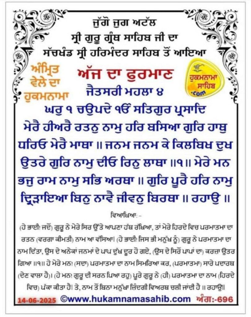 ਸੱਚਖੰਡ ਸ੍ਰੀ ਹਰਿਮੰਦਰ ਸਾਹਿਬ, ਸ੍ਰੀ ਅੰਮ੍ਰਿਤਸਰ,14-06-2025