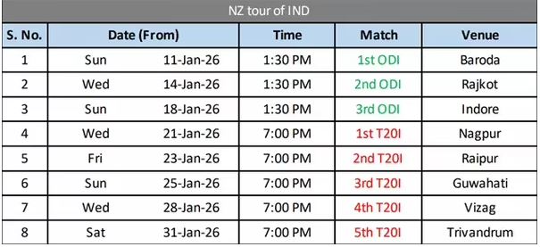 ਨਿਊਜ਼ੀਲੈਂਡ ਦਾ ਭਾਰਤ ਦੌਰਾ ਤਿੰਨ ਮੈਚਾਂ ਦੀ ਵਨ ਡੇ ਸੀਰੀਜ਼ ਨਾਲ ਸ਼ੁਰੂ ਹੋਵੇਗਾ। India vs New Zealand ਦਾ ਪਹਿਲਾ ਮੈਚ 11 ਜਨਵਰੀ ਨੂੰ ਬੜੌਦਾ ਵਿੱਚ ਖੇਡਿਆ ਜਾਵੇਗਾ, ਉਸ ਤੋਂ ਬਾਅਦ ਦੂਜਾ ਮੈਚ 14 ਜਨਵਰੀ ਨੂੰ ਰਾਜਕੋਟ ਵਿੱਚ ਖੇਡਿਆ ਜਾਵੇਗਾ। ਆਖਰੀ ਮੈਚ 18 ਜਨਵਰੀ ਨੂੰ ਇੰਦੌਰ ਵਿੱਚ ਹੋਣਾ ਹੈ।