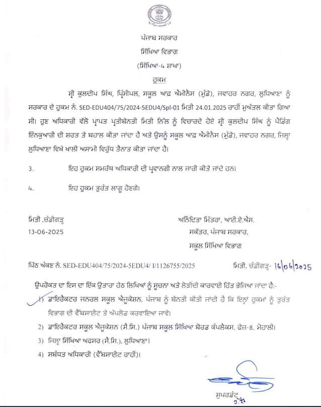 ਮੁਅੱਤਲ ਪ੍ਰਿੰਸੀਪਲ ਨੂੰ ਕੀਤਾ ਬਹਾਲ ਪੰਜਾਬ ਜੂਨ 18, 2025ਜੂਨ 18, 2025Leave a Comment on ਮੁਅੱਤਲ ਪ੍ਰਿੰਸੀਪਲ ਨੂੰ ਕੀਤਾ ਬਹਾਲ ਮੋਹਾਲੀ, 18 ਜੂਨ, ਦੇਸ਼ ਕਲਿੱਕ ਬਿਓਰੋ : ਸਿੱਖਿਆ ਵਿਭਾਗ ਵੱਲੋਂ ਮੁਅੱਤਲ ਕੀਤੇ ਗਏ ਪ੍ਰਿੰਸੀਪਲ ਨੂੰ ਬਹਾਲ ਕੀਤਾ ਗਿਆ ਹੈ।
