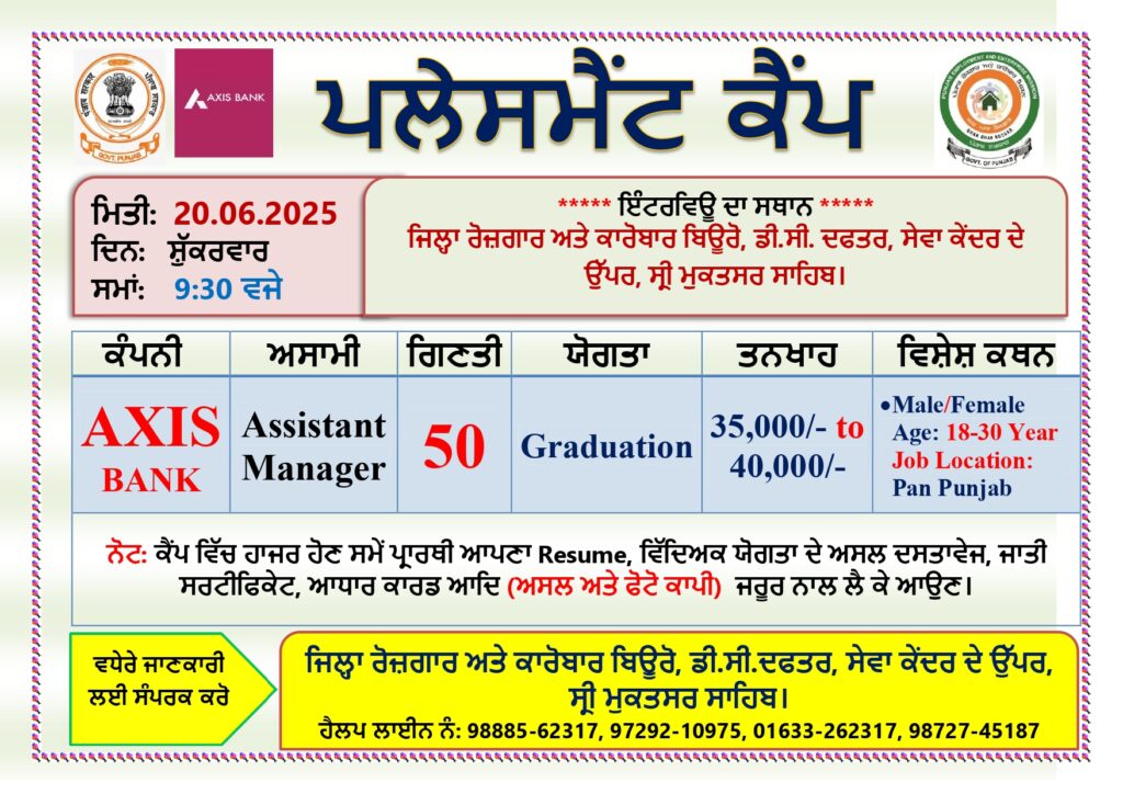 ਜ਼ਿਲ੍ਹਾ ਰੋਜ਼ਗਾਰ ਉਤਪੱਤੀ ਹੁਨਰ ਵਿਕਾਸ ਅਤੇ ਸਿਖਲਾਈ ਅਫਸਰ ਸ੍ਰੀਮਤੀ ਕੰਵਲਪੁਨੀਤ ਕੌਰ ਨੇ ਜਾਣਕਾਰੀ ਦਿੰਦੇ ਹੋਏ ਦੱਸਿਆ ਕਿ 20 ਜੂਨ 2025 ਨੂੰ ਜ਼ਿਲ੍ਹਾ ਰੋਜ਼ਗਾਰ ਅਤੇ ਕਾਰੋਬਾਰ ਬਿਊਰੋ, ਸ੍ਰੀ ਮੁਕਤਸਰ ਸਾਹਿਬ ਵਿਖੇ ਪਲੇਸਮੈਂਟ ਕੈਪ ਲਗਾਇਆ ਜਾ ਰਿਹਾ ਹੈ। ਇਸ ਪਲੇਸਮੈਂਟ ਕੈਂਪ ਵਿੱਚ ਐਕਸਿਸ ਬੈਂਕ ਕੰਪਨੀ ਵੱਲੋਂ 50 ਅਸਿਸਟੈਂਟ ਮੈਨੇਜ਼ਰ ਦੀਆਂ ਅਸਾਮੀਆਂ ਲਈ ਘੱਟ ਤੋਂ ਘੱਟ ਗਰੇਜੂਏਸ਼ਨ ਪਾਸ ਲੜਕੇ ਅਤੇ ਲੜਕੀਆਂ ਦੋਨਾਂ ਦੀ ਇੰਟਰਵਿਊ ਕੀਤੀ ਜਾਣੀ ਹੈ।