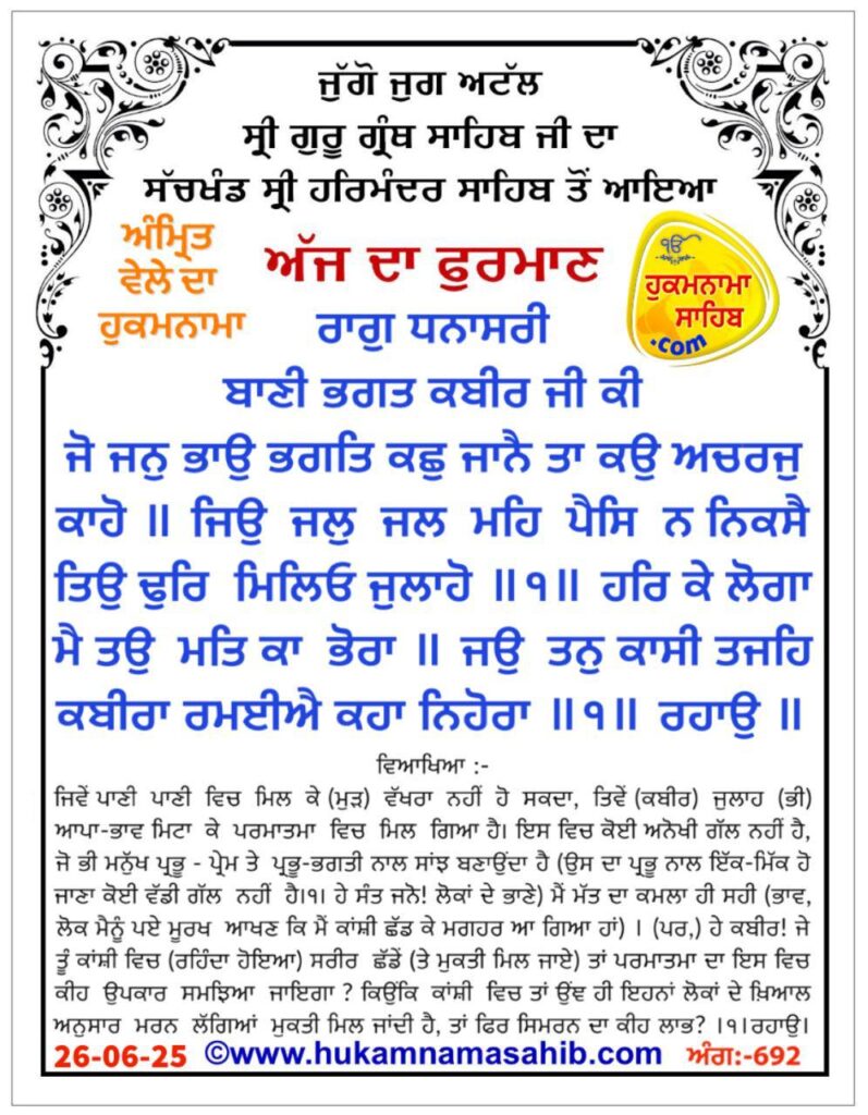 ਸੱਚਖੰਡ ਸ੍ਰੀ ਹਰਿਮੰਦਰ ਸਾਹਿਬ, ਸ੍ਰੀ ਅੰਮ੍ਰਿਤਸਰ, 26-06-2025