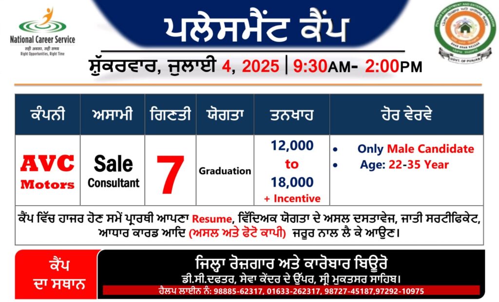 Recruitment of Sales Consultant: ਜ਼ਿਲ੍ਹਾ ਰੋਜ਼ਗਾਰ ਅਤੇ ਕਾਰੋਬਾਰ ਬਿਊਰੋ, ਸ੍ਰੀ ਮੁਕਤਸਰ ਸਾਹਿਬ ਵਿਖੇ 04 ਜੁਲਾਈ 2025 ਦਿਨ ਸ਼ੁੱਕਰਵਾਰ ਨੂੰ ਪਲੇਸਮੈਂਟ ਕੈਂਪ ਲਗਾਇਆ ਜਾ ਰਿਹਾ ਹੈ, ਇਹ ਜਾਣਕਾਰੀ ਪਲੇਸਮੈਂਟ ਅਫ਼ਸਰ ਦਲਜੀਤ ਸਿੰਘ ਬਰਾੜ ਨੇ ਦਿੱਤੀ। ਉਨ੍ਹਾਂ ਕਿਹਾ  ਕਿ ਇਸ ਪਲੇਸਮੈਂਟ ਕੈਂਪ ਵਿੱਚ ਏ.ਵੀ.ਸੀ. ਮੋਟਰ ਪ੍ਰਾਈਵੇਟ ਲਿਮਟਿਡ ਕੰਪਨੀ ਵੱਲੋਂ ਸੇਲਜ ਕੰਸਲਟੈਂਟ (Sales Consultant) ਦੀ ਅਸਾਮੀ (Recruitment) ਲਈ ਕੇਵਲ ਲੜਕਿਆਂ ਦੀ ਇੰਟਰਵਿਊ ਕੀਤੀ ਜਾਣੀ ਹੈ। ਇੰਟਰਵਿਊ ਲਈ ਵਿੱਦਿਅਕ ਯੋਗਤਾ ਗ੍ਰੈਜੂਏਸ਼ਨ ਪਾਸ, ਉਮਰ 22 ਤੋਂ 35 ਸਾਲ ਹੋਣੀ ਚਾਹੀਦੀ ਹੈ।