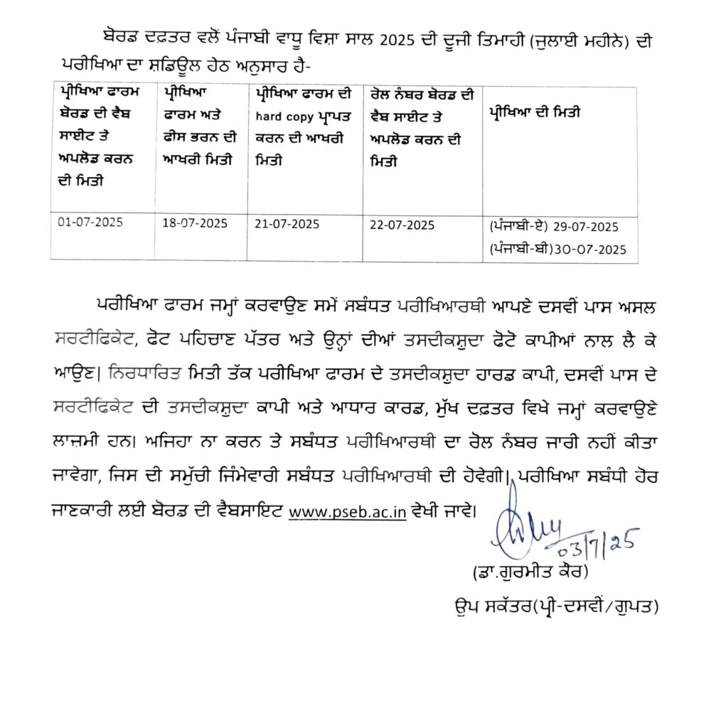 ਸਿੱਖਿਆ ਬੋਰਡ ਨੇ ਪੰਜਾਬੀ ਵਾਧੂ ਵਿਸ਼ੇ ਦੀ ਪ੍ਰੀਖਿਆ ਲਈ ਸ਼ਡਿਊਲ ਕੀਤਾ ਜਾਰੀ