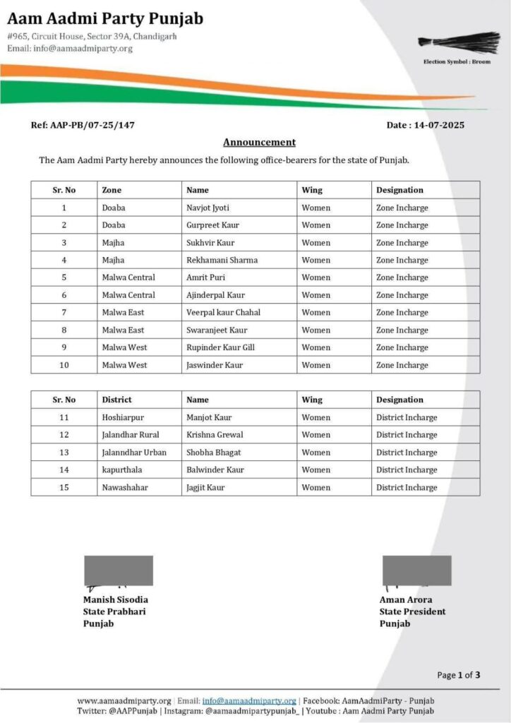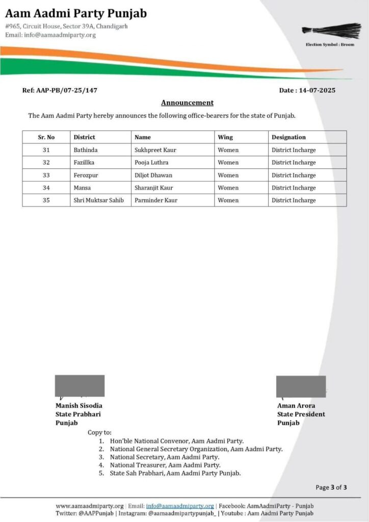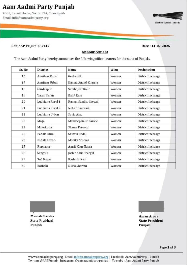 ‘ਆਪ’ ਵੱਲੋਂ ਪੰਜਾਬ ‘ਚ ਮਹਿਲਾ ਵਿੰਗ ਦੇ ਅਹੁਦੇਦਾਰਾਂ ਦਾ ਐਲਾਨ ਪੰਜਾਬ ਜੁਲਾਈ 14, 2025ਜੁਲਾਈ 14, 2025Leave a Comment on ‘ਆਪ’ ਵੱਲੋਂ ਪੰਜਾਬ ‘ਚ ਮਹਿਲਾ ਵਿੰਗ ਦੇ ਅਹੁਦੇਦਾਰਾਂ ਦਾ ਐਲਾਨ ਚੰਡੀਗੜ੍ਹ, 14 ਜੁਲਾਈ, ਦੇਸ਼ ਕਲਿੱਕ ਬਿਓਰੋ : ਆਮ ਆਦਮੀ ਪਾਰਟੀ ਪੰਜਾਬ ਵੱਲੋਂ ਮਹਿਲਾ ਵਿੰਗ (Women Wing) ਦੇ ਅਹੁਦੇਦਾਰਾਂ ਦਾ ਐਲਾਨ ਕੀਤਾ ਗਿਆ ਹੈ।