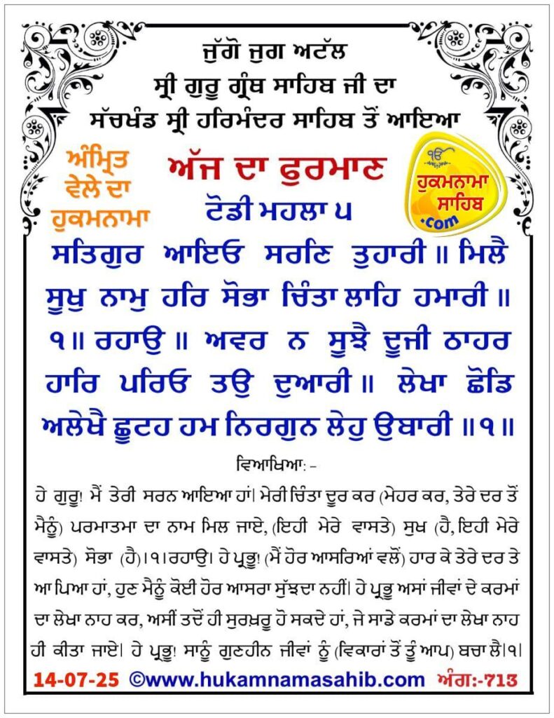 ਅੰਮ੍ਰਿਤ ਵੇਲੇ ਦਾ ਹੁਕਮਨਾਮਾ ਸ੍ਰੀ ਦਰਬਾਰ ਸਾਹਿਬ ਅੰਮ੍ਰਿਤਸਰ