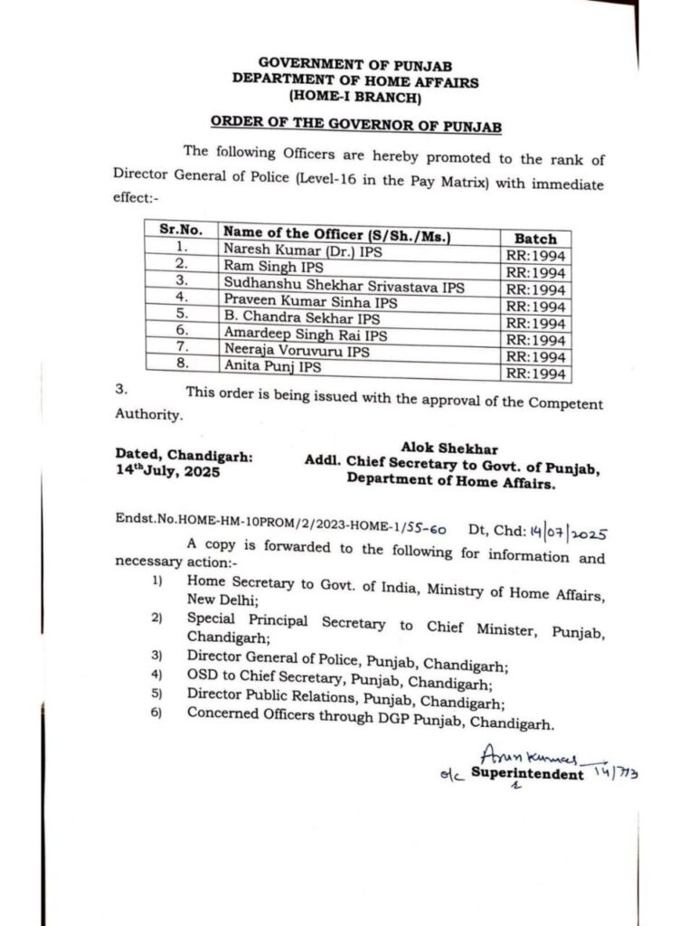 ਪੰਜਾਬ ਸਰਕਾਰ ਵੱਲੋਂ IPS ਅਧਿਕਾਰੀਆਂ ਦੀਆਂ ਤਰੱਕੀਆਂ Punjab ਜੁਲਾਈ 14, 2025ਜੁਲਾਈ 14, 2025Leave a Comment on ਪੰਜਾਬ ਸਰਕਾਰ ਵੱਲੋਂ IPS ਅਧਿਕਾਰੀਆਂ ਦੀਆਂ ਤਰੱਕੀਆਂ ਚੰਡੀਗੜ੍ਹ, 14 ਜੁਲਾਈ, ਦੇਸ਼ ਕਲਿੱਕ ਬਿਓਰੋ : ਪੰਜਾਬ ਸਰਕਾਰ ਵੱਲੋਂ 8 ਆਈਪੀਐਸ ਅਧਿਕਾਰੀਆਂ ਦੀਆਂ ਤਰੱਕੀਆਂ ਕੀਤੀਆਂ ਗਈਆਂ ਹਨ।