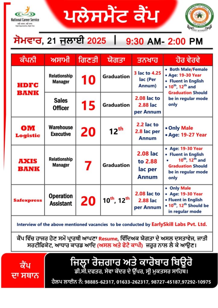 ਜਿਲ੍ਹਾ ਰੋਜ਼ਗਾਰ ਅਫ਼ਸਰ ਕੰਵਲਪੁਨਿਤ ਕੌਰ ਨੇ ਜਾਣਕਾਰੀ ਦਿੰਦੇ ਹੋਏ ਦੱਸਿਆ ਕਿ ਜਿਲ੍ਹਾ ਰੋਜ਼ਗਾਰ ਅਤੇ ਕਾਰੋਬਾਰ ਬਿਊਰੋ, ਸ੍ਰੀ ਮੁਕਤਸਰ ਸਾਹਿਬ ਵਿਖੇ 21 ਜੁਲਾਈ 2025 ਸੋਮਵਾਰ ਨੂੰ ਪਲੇਸਮੈਂਟ ਕੈਂਪ ਲਗਾਇਆ ਜਾ ਰਿਹਾ ਹੈ।