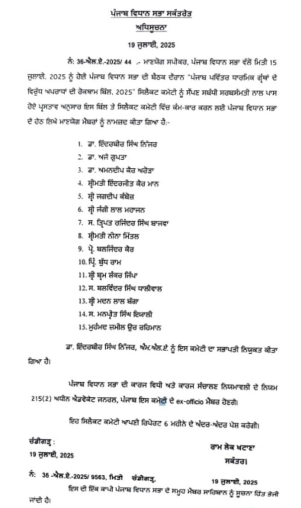 ਬੇਅਦਬੀ ਬਿੱਲ ’ਤੇ ਬਣੀ ਸਿਲੈਕਟ ਕਮੇਟੀ ਦੇ ਮੈਂਬਰਾਂ ਦਾ ਐਲਾਨ ਪੰਜਾਬ ਜੁਲਾਈ 19, 2025ਜੁਲਾਈ 19, 2025Leave a Comment on ਬੇਅਦਬੀ ਬਿੱਲ ’ਤੇ ਬਣੀ ਸਿਲੈਕਟ ਕਮੇਟੀ ਦੇ ਮੈਂਬਰਾਂ ਦਾ ਐਲਾਨ ਚੰਡੀਗੜ੍ਹ, 19 ਜੁਲਾਈ, ਦੇਸ਼ ਕਲਿੱਕ ਬਿਓਰੋ : ਪੰਜਾਬ ਵਿਧਾਨ ਸਭਾ ਵਿੱਚ ਪੰਜਾਬ ਪਵਿੱਤਰ ਧਾਰਮਿਕ ਗ੍ਰੰਥਾਂ ਦੇ ਵਿਰੁੱਧ ਅਪਰਾਧਾਂ ਦੀ ਰੋਕਥਾਮ ਬਿੱਲ, 2025 ਪੇਸ਼ ਕੀਤਾ ਗਿਆ ਸੀ, ਜਿਸ ਨੂੰ ਸਿਲੈਕਟ ਕਮੇਟੀ ਕੋਲ ਭੇਜਣ ਦਾ ਫੈਸਲਾ ਕੀਤਾ ਗਿਆ ਸੀ। ਹੁਣ ਸਿਲੈਕਟ ਕਮੇਟੀ ਦੇ ਮੈਂਬਰਾਂ ਦਾ ਐਲਾਨ ਕਰ ਦਿੱਤਾ ਗਿਆ ਹੈ।