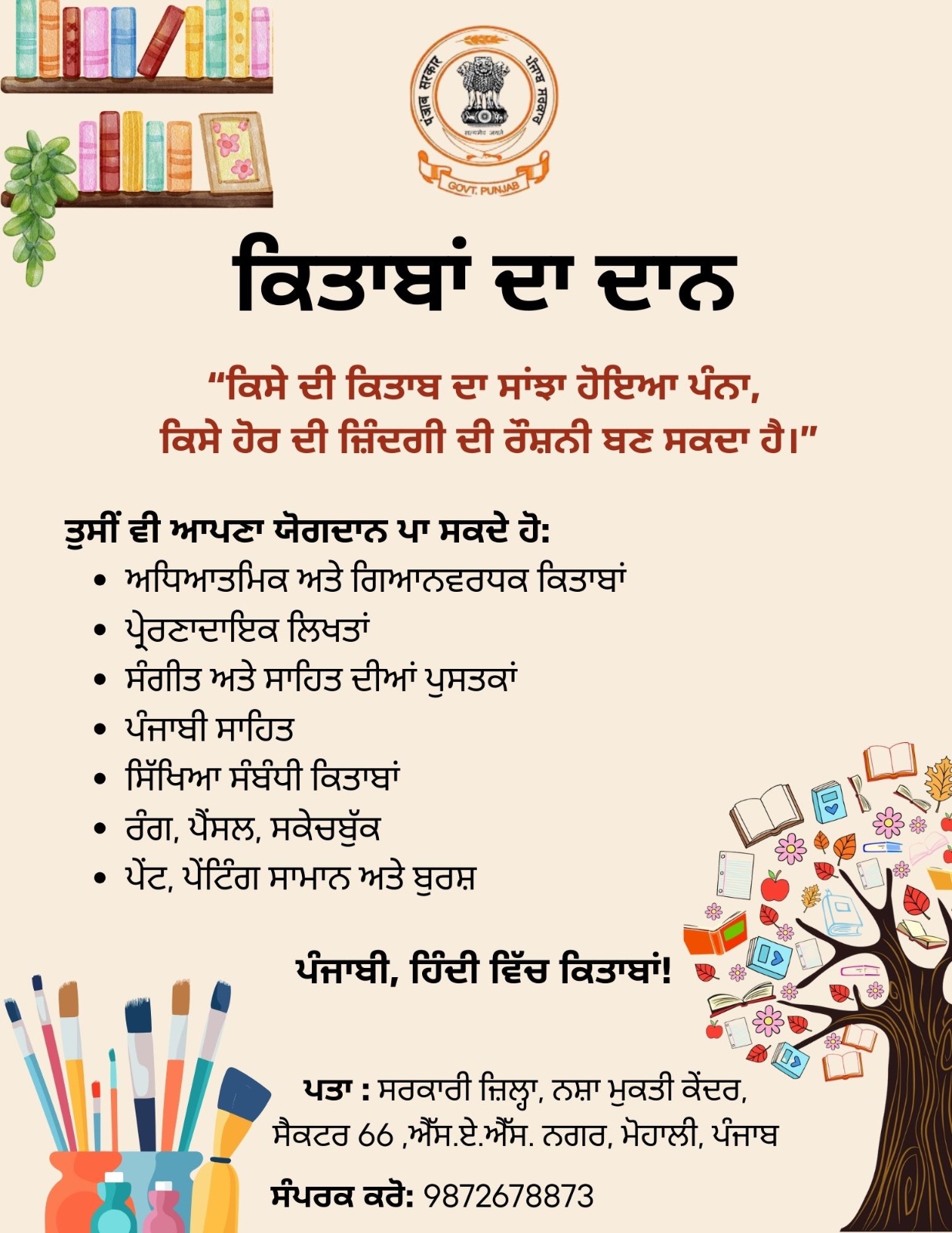 ਵਸਤੂਆਂ ਦਾਨ ਕਰਨ ਜਾਂ ਆਪਣਾ ਸਮਾਂ ਸਵੈ-ਇੱਛਾ ਨਾਲ ਦੇਣ ਦੇ ਇੱਛੁਕ ਨਾਗਰਿਕ ਜ਼ਿਲ੍ਹਾ ਨਸ਼ਾ ਮੁਕਤੀ ਕੇਂਦਰ, ਸੈਕਟਰ 66, ਮੋਹਾਲੀ ਨਾਲ ਸੰਪਰਕ ਕਰ ਸਕਦੇ ਹਨ।