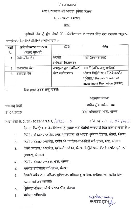 ਪੰਜਾਬ ਸਰਕਾਰ ਵੱਲੋਂ ਤਹਿਸੀਲਦਾਰਾਂ ਦੀਆਂ ਬਦਲੀਆਂ ਪੰਜਾਬ ਜੁਲਾਈ 22, 2025ਜੁਲਾਈ 22, 2025Leave a Comment on ਪੰਜਾਬ ਸਰਕਾਰ ਵੱਲੋਂ ਤਹਿਸੀਲਦਾਰਾਂ ਦੀਆਂ ਬਦਲੀਆਂ ਚੰਡੀਗੜ੍ਹ, 22 ਜੁਲਾਈ, ਦੇਸ਼ ਕਲਿੱਕ ਬਿਓਰੋ : ਪੰਜਾਬ ਸਰਕਾਰ ਵੱਲੋਂ ਪ੍ਰਬੰਧਕੀ ਪੱਖਾਂ ਨੂੰ ਰੱਖਦੇ ਹੋਏ ਤਹਿਸੀਦਲਾਰ ਕਾਡਰ ਵਿੱਚ ਬਦਲੀਆਂ ਕੀਤੀਆਂ ਗਈਆਂ ਹਨ। ਸਰਕਾਰ ਵੱਲੋਂ ਜਾਰੀ ਹੁਕਮਾਂ ਵਿੱਚ ਕਿਹਾ ਗਿਆ ਹੈ ਕਿ ਇਹ ਬਦਲੀਆਂ ਤੁਰੰਤ ਪ੍ਰਭਾਵ ਨਾਲ ਲਾਗੂ ਹੋਣਗੀਆਂ।