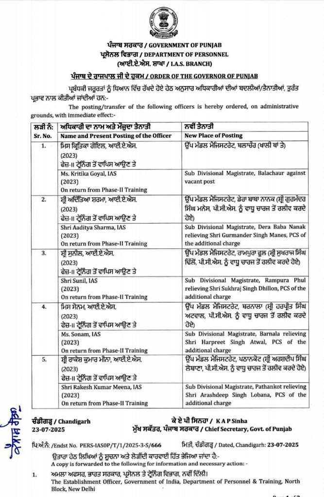 ਪੰਜਾਬ ਸਰਕਾਰ ਵੱਲੋਂ 5 IAS ਅਧਿਕਾਰੀਆਂ ਦੀਆਂ ਬਦਲੀਆਂ ਪੰਜਾਬ ਜੁਲਾਈ 24, 2025ਜੁਲਾਈ 24, 2025Leave a Comment on ਪੰਜਾਬ ਸਰਕਾਰ ਵੱਲੋਂ 5 IAS ਅਧਿਕਾਰੀਆਂ ਦੀਆਂ ਬਦਲੀਆਂ ਚੰਡੀਗੜ੍ਹ, 24 ਜੁਲਾਈ, ਦੇਸ਼ ਕਲਿੱਕ ਬਿਓਰੋ : ਪੰਜਾਬ ਸਰਕਾਰ ਵੱਲੋਂ 5 IAS ਅਧਿਕਾਰੀਆਂ ਦੀਆਂ ਬਦਲੀਆਂ ਕੀਤੀਆਂ ਗਈਆਂ ਹਨ। ਪੰਜਾਬ ਸਰਕਾਰ ਵੱਲੋਂ ਜਾਰੀ ਹੁਕਮਾਂ ਵਿੱਚ ਕਿਹਾ ਗਿਆ ਕਿ ਇਹ ਬਦਲੀਆਂ ਤੁਰੰਤ ਪ੍ਰਭਾਵ ਨਾਲ ਲਾਗੂ ਹੋਣਗੀਆਂ।