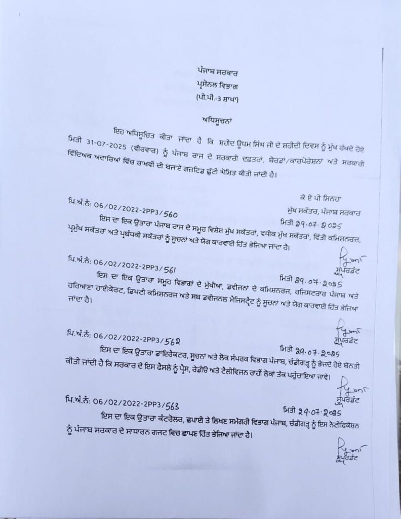 ਪੰਜਾਬ ਸਰਕਾਰ ਨੇ ਸ਼ਹੀਦ ਊਧਮ ਸਿੰਘ ਦੇ ਸ਼ਹੀਦੀ ਦਿਵਸ (31 ਜੁਲਾਈ) ‘ਤੇ ਪੂਰੇ ਸੂਬੇ ਵਿੱਚ ਗਜ਼ਟਿਡ ਛੁੱਟੀ (gazetted holiday) ਦਾ ਐਲਾਨ ਕੀਤਾ ਹੈ। ਇਸ ਦਿਨ ਸਾਰੇ ਸਰਕਾਰੀ ਦਫ਼ਤਰ, ਸਕੂਲ ਅਤੇ ਕਾਲਜ ਬੰਦ ਰਹਿਣਗੇ। ਨਾਲ ਹੀ ਭਵਾਨੀਗੜ੍ਹ-ਸੁਨਾਮ ਰੋਡ ਦਾ ਨਾਮ ਹੁਣ ਸ਼ਹੀਦ ਊਧਮ ਸਿੰਘ ਮਾਰਗ ਰੱਖਿਆ ਜਾਵੇਗਾ।