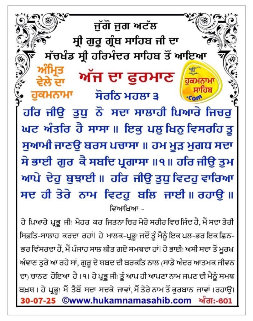 ਸੱਚਖੰਡ ਸ੍ਰੀ ਹਰਿਮੰਦਰ ਸਾਹਿਬ, ਸ੍ਰੀ ਅੰਮ੍ਰਿਤਸਰ, 30-07-2025