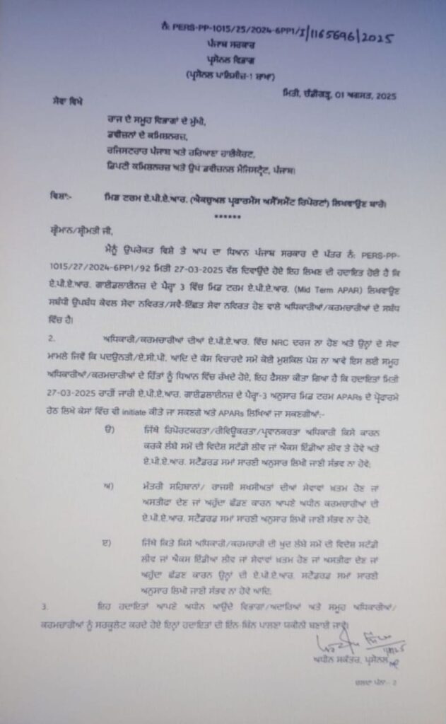 ਪੰਜਾਬ ਸਰਕਾਰ ਵੱਲੋਂ ਸਰਕਾਰੀ ਮੁਲਾਜ਼ਮਾਂ ਦੀ ਏ ਪੀ ਏ ਆਰ ਲਿਖਣ ਸਬੰਧੀ ਇਕ ਅਹਿਮ ਪੱਤਰ ਜਾਰੀ ਕੀਤਾ ਗਿਆ ਹੈ। ਸਰਕਾਰ ਵੱਲੋਂ ਮਿਡ ਟਰਮ ਏ ਪੀ ਏ ਆਰ (ਐਕਜੂਅਲ ਪ੍ਰਫਾਰਮੈਸ ਅਸੈਸਮੈਂਟ ਰਿਪੋਰਟ) ਲਿਖਵਾਉਣ ਨੂੰ ਲੈ ਕੇ ਹੁਕਮ ਜਾਰੀ ਕੀਤੇ ਹਨ।