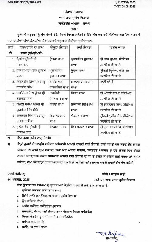 ਪੰਜਾਬ ਸਰਕਾਰ ਵੱਲੋਂ ਸਿਵਲ ਸਕੱਤਰੇਤ ’ਚ ਕਰਮਚਾਰੀਆਂ ਦੀਆਂ ਤੈਨਾਤੀਆਂ ਪੰਜਾਬ ਅਗਸਤ 4, 2025ਅਗਸਤ 4, 2025Leave a Comment on ਪੰਜਾਬ ਸਰਕਾਰ ਵੱਲੋਂ ਸਿਵਲ ਸਕੱਤਰੇਤ ’ਚ ਕਰਮਚਾਰੀਆਂ ਦੀਆਂ ਤੈਨਾਤੀਆਂ ਚੰਡੀਗੜ੍ਹ, 4 ਅਗਸਤ, ਦੇਸ਼ ਕਲਿੱਕ ਬਿਓਰੋ : ਪੰਜਾਬ ਸਰਕਾਰ ਦੇ ਆਮ ਰਾਜ ਪ੍ਰਬੰਧ ਵਿਭਾਗ ਵੱਲੋਂ ਪ੍ਰਬੰਧਕੀ ਜ਼ਰੂਰਤਾਂ ਨੂੰ ਮੁੱਖ ਰੱਖਦੇ ਹੋਏ ਪੰਜਾਬ ਸਿਵਲ ਸਕੱਤਰੇਤ ਵਿੱਚ ਕੰਮ ਕਰ ਰਹੇ ਸੀਨੀਅਰ ਸਹਾਇਕ ਕਾਡਰ ਦੇ ਕਰਮਚਾਰੀਆਂ ਦੀਆਂ ਤੈਨਾਤੀਆਂ ਕੀਤੀਆਂ ਗਈਆਂ ਹਨ।