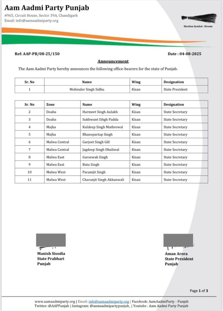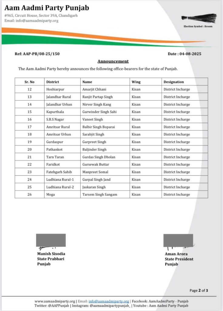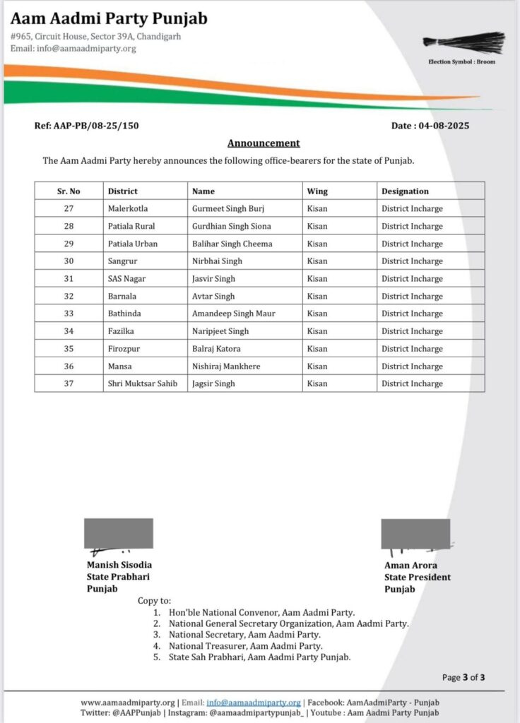ਆਮ ਆਦਮੀ ਪਾਰਟੀ ਪੰਜਾਬ ਵੱਲੋਂ ਕਿਸਾਨ ਵਿੰਗ ਦੇ ਅਹੁਦੇਦਾਰਾਂ ਦਾ ਐਲਾਨ
