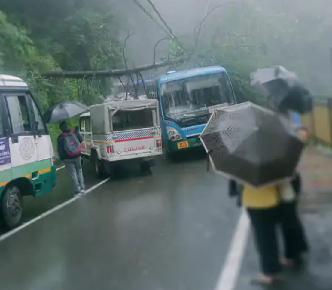 ਸਵੇਰੇ ਛੋਟਾ ਸ਼ਿਮਲਾ ਸਕੱਤਰੇਤ ਨੇੜੇ ਇੱਕ ਚੱਲਦੀ ਬੱਸ ‘ਤੇ ਇੱਕ ਦਰੱਖਤ ਡਿੱਗ ਗਿਆ, ਪਰ ਖੁਸ਼ਕਿਸਮਤੀ ਨਾਲ ਅੱਧਾ ਦਰੱਖਤ ਕੇਬਲ ਲਾਈਨ ‘ਤੇ ਰੁਕ ਗਿਆ, ਜਿਸ ਨਾਲ ਇੱਕ ਵੱਡਾ ਹਾਦਸਾ ਟਲ ਗਿਆ।