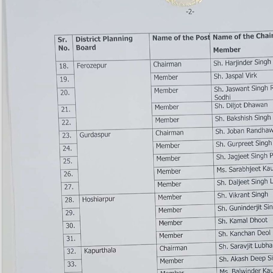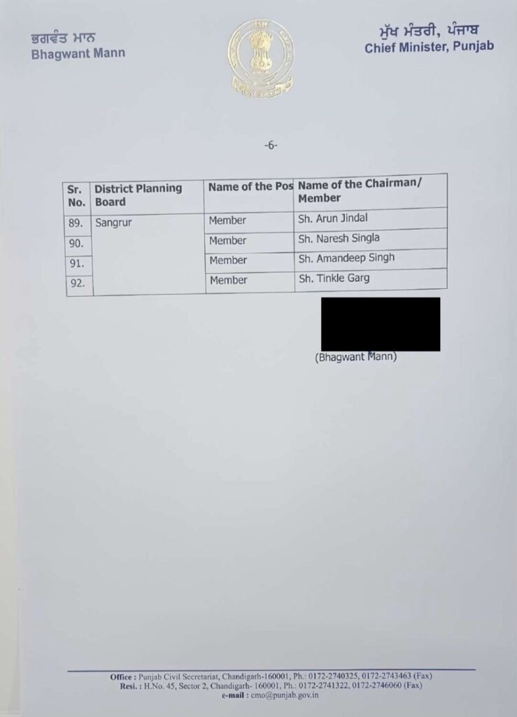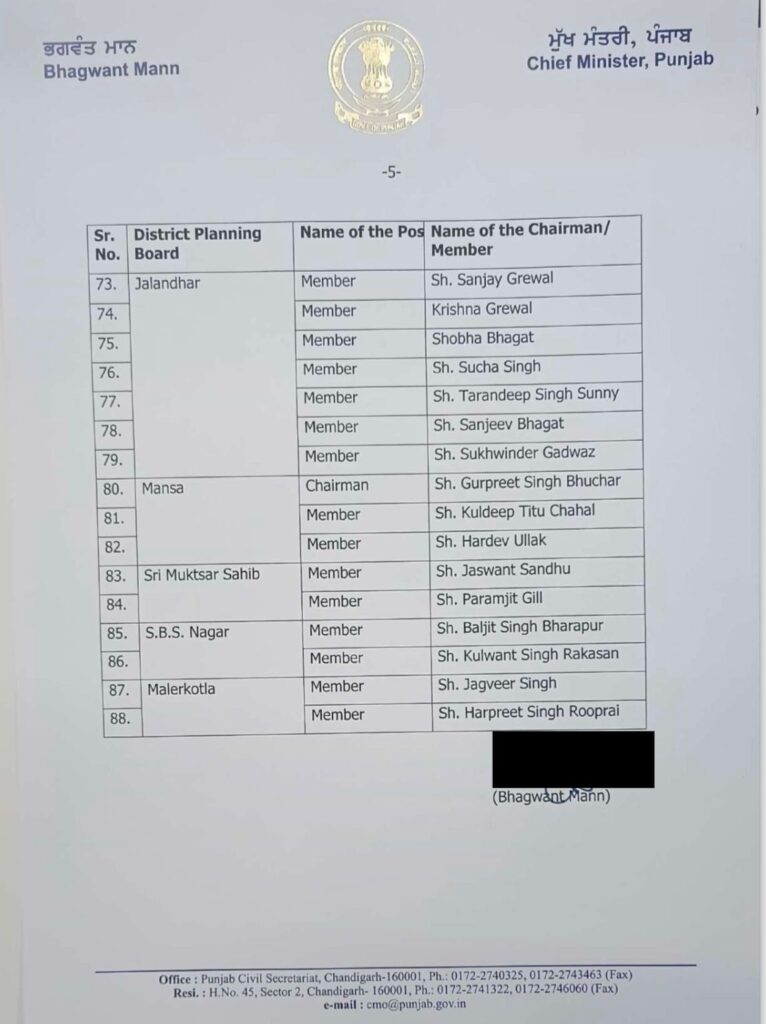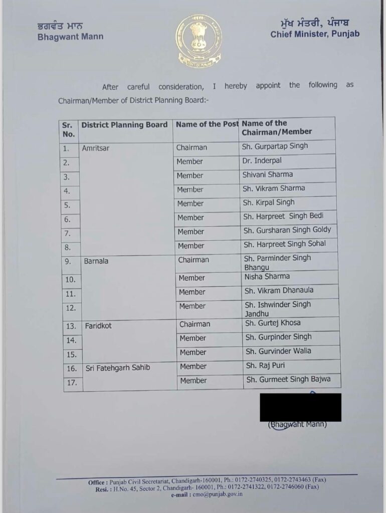 ਪੰਜਾਬ ਦੇ ਮੁੱਖ ਮੰਤਰੀ ਭਗਵੰਤ ਮਾਨ ਵੱਲੋਂ ਜ਼ਿਲ੍ਹਾ ਪਲਾਨਿੰਗ ਬੋਰਡ ਦੇ ਚੇਅਰਮੈਨ ਅਤੇ ਮੈਂਬਰ ਨਿਯੁਕਮ ਕੀਤੇ ਗਏ ਹਨ। ਮੁੱਖ ਮੰਤਰੀ ਨੇ ਲਿਖਿਆ ਹੈ, ਜ਼ਿਲ੍ਹਾ ਪਲਾਨਿੰਗ ਬੋਰਡ ਦੇ ਚੇਅਰਮੈਨ ਅਤੇ ਮੈਂਬਰ ਨਿਯੁਕਤ ਕੀਤੇ ਗਏ ਹਨ। ਸਾਰਿਆਂ ਨੂੰ ਨਵੀਂ ਜ਼ਿੰਮੇਵਾਰੀ ਲਈ ਸ਼ੁਭਕਾਮਨਾਵਾਂ। ਰੰਗਲਾ ਪੰਜਾਬ ਟੀਮ ਵਿੱਚ ਸੱਭ ਦਾ ਨਿੱਘਾ ਸਵਾਗਤ ਹੈ।
