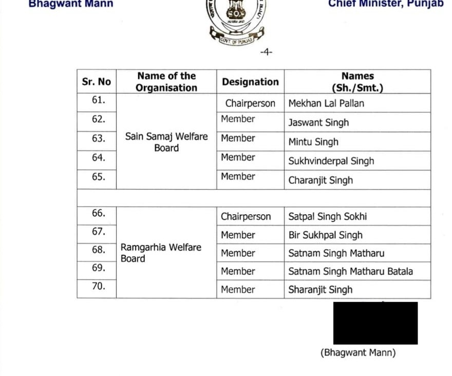 ਪੰਜਾਬ ਦੇ ਮੁੱਖ ਮੰਤਰੀ ਭਗਵੰਤ ਮਾਨ ਵੱਲੋਂ ਸੂਬੇ ਦੇ ਵੱਖ-ਵੱਖ ਵਰਗਾਂ ਦੇ ਬੋਰਡ/ਕਾਰਪੋਰੇਸ਼ਨ ਦੇ ਚੇਅਰਪਰਸਨ ਅਤੇ ਮੈਂਬਰ ਨਿਯੁਕਤ ਕੀਤੇ ਗਏ ਹਨ। ਮੁੱਖ ਮੰਤਰੀ ਨੇ ਨਵੀਂ ਜ਼ਿੰਮੇਵਾਰੀ ਲਈ ਸਾਰਿਆਂ ਨੂੰ ਦਿਲੋਂ ਸ਼ੁਭਕਾਮਨਾਵਾਂ ਦਿੱਤੀਆਂ ਹਨ। ਉਨ੍ਹਾਂ ਕਿਹਾ ਕਿ ਉਮੀਦ ਕਰਦਾ ਹਾਂ ਕਿ ਸਾਰੇ ਸਾਥੀ ਆਪਣੀ ਜ਼ਿੰਮੇਵਾਰੀ ਨੂੰ ਸਮਾਜ ਦੀ ਭਲਾਈ ਅਤੇ ਪੰਜਾਬ ਦੀ ਤਰੱਕੀ ਲਈ ਪੂਰੀ ਤਨਦੇਹੀ ਨਾਲ ਨਿਭਾਉਣਗੇ।