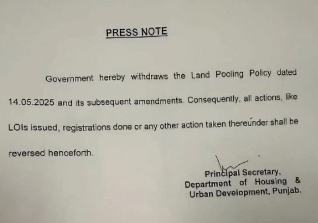 ਪ੍ਰੈਸ ਦੇ ਨਾਂ ਬਿਆਨ ਜਾਰੀ ਕਰਦਿਆਂ ਸੰਯੁਕਤ ਕਿਸਾਨ ਮੋਰਚਾ ਨੇ ਕਿਹਾ ਹੈ ਕਿ ਲੈਂਡ ਪੂਲਿੰਗ ਸਕੀਮ ਵਿਰੁੱਧ ਲੋਕਾਂ ਦਾ ਰੋਹ ਦਿਨੋਂ ਦਿਨ ਵੱਧਦਾ ਜਾ ਰਿਹਾ ਸੀ। ਸ਼ਹਿਰੀਕਰਨ ਦੇ ਨਾਂ ਹੇਠ ਪਿੰਡਾਂ ਨੂੰ ਉਜਾੜਨ ਲਈ ਲਿਆਂਦੀ ਗਈ ਇਸ ਸਕੀਮ ਵਿਰੁੱਧ ਸੰਯੁਕਤ ਕਿਸਾਨ ਮੋਰਚਾ ਲਗਾਤਾਰ ਸੰਘਰਸ਼ ਕਰ ਰਿਹਾ ਸੀ।30 ਜੁਲਾਈ ਨੂੰ ਸੂਬੇ ਵਿਚ ਵੱਡੀ ਪੱਧਰ ਤੇ ਟਰੈਕਟਰਾਂ ਅਤੇ ਵਹੀਕਲਾਂ ਨਾਲ ਉਮੜੇ ਹਜ਼ਾਰਾਂ ਕਿਸਾਨਾਂ ਮਜ਼ਦੂਰਾਂ ਦੇ ਰੋਹ ਨੇ ਭਵਿੱਖੀ ਅੰਦੋਲਨ ਦੇ ਅੰਗੜਾਈ ਲੈਣ ਦਾ ਸਪੱਸ਼ਟ ਸੁਨੇਹਾ ਪੰਜਾਬ ਸਰਕਾਰ ਨੂੰ ਦੇ ਦਿੱਤਾ ਸੀ। 24 ਅਗਸਤ ਦੀ ਸਮਰਾਲਾ ਰੈਲੀ ਲਈ ਸੂਬੇ ਭਰ ਵਿਚ ਹੋ ਰਹੀਆਂ ਜ਼ੋਰਦਾਰ ਤਿਆਰੀਆਂ ਦੀਆਂ ਰਿਪੋਰਟਾਂ ਦਾ ਵੀ ਪੰਜਾਬ ਸਰਕਾਰ ਨੂੰ ਇਲਮ ਸੀ। ਸਿੱਟੇ ਵਜੋਂ ਪੰਜਾਬ ਸਰਕਾਰ ਦੇ ਮਕਾਨ ਅਤੇ ਸ਼ਹਿਰੀ ਵਿਕਾਸ ਵਿਭਾਗ ਨੇ ਸਕੀਮ ਨੂੰ ਵਾਪਸ ਲੈਣ ਸਬੰਧੀ ਪ੍ਰੈਸ ਬਿਆਨ ਜਾਰੀ ਕੀਤਾ ਹੈ।