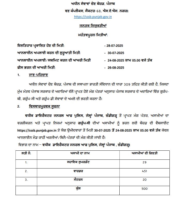 ਸਰਕਾਰੀ ਨੌਕਰੀਆਂ ਦੀ ਉਡੀਕ ਕਰ ਰਹੇ ਨੌਜਵਾਨਾਂ ਲਈ ਇਹ ਚੰਗੀ ਖਬਰ ਹੈ ਕਿ ਪੰਜਾਬ ਸਰਕਾਰ ਵੱਲੋਂ ਅਸਾਮੀਆਂ ਕੱਢੀਆਂ ਗਈਆਂ ਹਨ। ਪੰਜਾਬ ਸਰਕਾਰ ਵੱਲੋਂ ਅਧੀਨ ਸੇਵਾਵਾਂ ਚੋਣ ਬੋਰਡ ਰਾਹੀਂ 500 ਅਸਾਮੀਆਂ ਲਈ ਅਰਜ਼ੀਆਂ ਦੀ ਮੰਗ ਕੀਤੀ ਗਈ ਹੈ। ਐਸਐਸਐਸਬੀ ਵੱਲੋਂ 29 ਸਹਾਇਕ ਸੁਪਰਡੰਟ, 451 ਵਾਰਡਰ, 20 ਮੈਟਰਨ ਕੁਲ 500 ਅਸਾਮੀਆਂ ਲਈ ਆਨਲਾਈਨ ਅਰਜ਼ੀਆਂ ਦੀ ਮੰਗ ਕੀਤੀ ਗਈ ਹੈ। ਯੋਗ ਉਮੀਦਵਾਰ 24 ਅਗਸਤ ਤੱਕ ਆਨਲਾਈਨ ਅਪਲਾਈ ਕਰ ਸਕਦੇ ਹਨ।