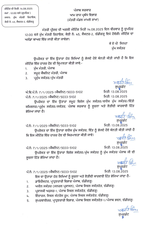 ਪੰਜਾਬ ਮੰਤਰੀ ਮੰਡਲ ਦੀ ਮੀਟਿੰਗ ਭਲਕੇ ਪੰਜਾਬ ਅਗਸਤ 13, 2025ਅਗਸਤ 13, 2025Leave a Comment on ਪੰਜਾਬ ਮੰਤਰੀ ਮੰਡਲ ਦੀ ਮੀਟਿੰਗ ਭਲਕੇ ਚੰਡੀਗੜ੍ਹ: 13 ਅਗਸਤ, ਦੇਸ਼ ਕਲਿੱਕ ਬਿਓਰੋ ਪੰਜਾਬ ਮੰਤਰੀ ਮੰਡਲ ਦੀ ਅਹਿਮ ਮੀਟਿੰਗ ਕੱਲ੍ਹ ਮਿਤੀ 14– 8– 2025 ਨੂੰ ਹੋ ਰਹੀ ਹੈ । ਇਹ ਮੀਟਿੰਗ ਕੱਲ੍ਹ ਦੁਪਹਿਰ 12 ਵਜੇ ਮੁੱਖ ਮੰਤਰੀ ਰਿਹਾਇਸ਼ ‘ਤੇ ਹੋਵੇਗੀ। ਇਸ ਮੀਟਿੰਗ ਵਿੱਚ ਪੰਜਾਬ ਲਈ ਕਈ ਅਹਿਮ ਫੈਸਲਿਆਂ ‘ਤੇ ਮੋਹਰ ਲੱਗ ਸਕਦੀ ਹੈ।