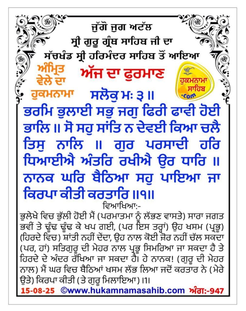 Deluded by doubt, I wandered over the whole world. Searching, I became frustrated. My Husband Lord has not blessed me with peace and tranquility; what will work with Him? By Guru’s Grace, I meditate on the Lord; I enshrine Him deep within my heart. O Nanak, seated in his her own home, she finds her Husband Lord, when the Creator Lord grants His Grace. || 1 || THIRD MEHL: Chasing after worldly affairs, the day is wasted, and the night passes in sleep. Speaking lies, one eats poison; the self-willed manmukh departs, crying out in pain. The Mesenger of Death holds his club over the mortal’s head; in the love of duality, he loses his honor. He never even thinks of the Name of the Lord; over and over again, he comes and goes in reincarnation. But if, by Guru’s Grace, the Lord’s Name comes to dwell in his mind, then the Messenger of Death will not strike him down with his club. Then, O Nanak, he merges intuitively into the Lord, receiving His Grace. || 2 || PAUREE: Some are linked to His Praises, when the Lord blesses them with the Guru’s Teachings. Some are blessed with the Name of the eternal, unchanging True Lord. Water, air and fire, by His Will, worship Him. They are held in the Fear of God; He has formed the perfect form. The Hukam, the Command of the One Lord is all-pervasive; accepting it, peace is found. || 3 ||