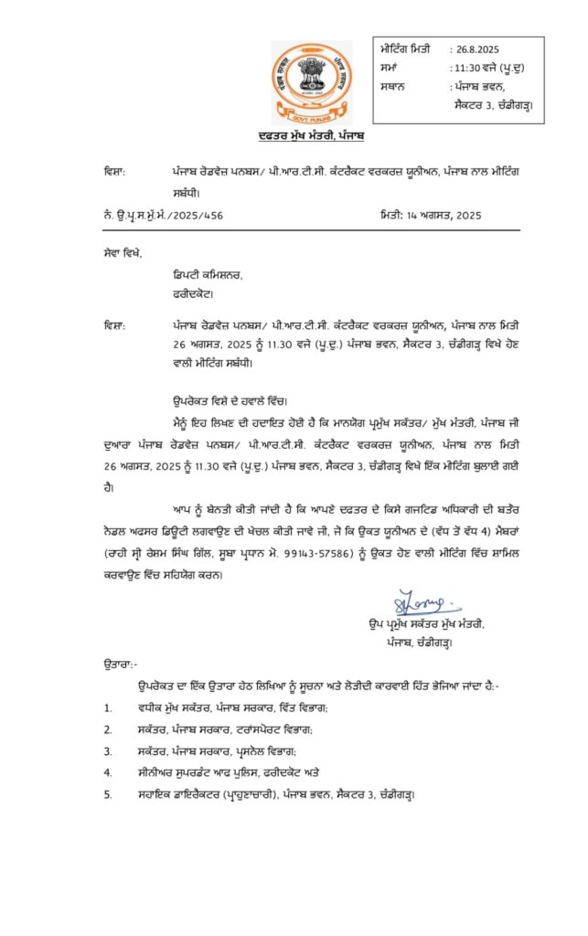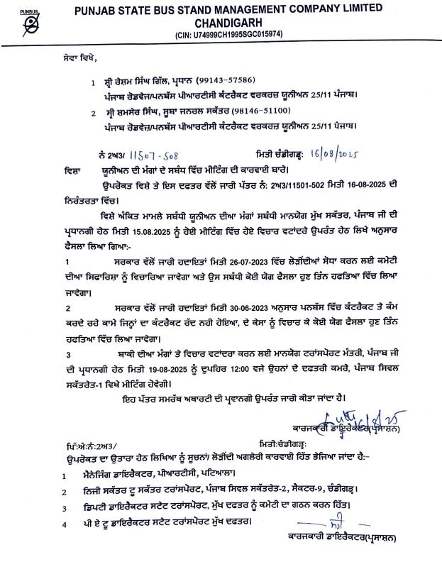 ਕੱਚੇ ਮੁਲਾਜ਼ਮਾਂ ਦੇ ਪੱਕੇ ਕਰਨ, ਠੇਕੇਦਾਰ ਪ੍ਰਥਾ ਖਤਮ ਕਰਨ ਅਤੇ ਕਿਲੋਮੀਟਰ ਸਕੀਮ ਬੱਸਾਂ ਦਾ ਟੈਂਟਰ ਰੱਦ ਕਰਾਉਣ ਲਈ ਚੱਲ ਰਹੇ ਸੰਘਰਸ਼ਕਾਰੀ ਮੁਲਾਜ਼ਮਾਂ ਦੀ ਮੁੱਖ ਮੰਤਰੀ ਭਗਵੰਤ ਮਾਨ ਨਾਲ ਮੀਟਿੰਗ ਤੈਅ ਹੋਈ ਹੈ। ਇਸ ਤੋਂ ਪਹਿਲਾਂ ਅਣਮਿੱਥੇ ਸਮੇਂ ਦੀ ਹੜਤਾਲ ਸਬੰਧੀ ਬੀਤੇ ਦਿਨੀਂ ਚੀਫ਼ ਸੈਕਟਰੀ ਪੰਜਾਬ ਨਾਲ ਪੈਂਨਲ ਮੀਟਿੰਗ ਹੋਈ ਸੀ, ਜਿਸ ਵਿੱਚ ਕੱਚੇ ਮੁਲਾਜ਼ਮਾਂ ਨੂੰ ਪੱਕਾ ਕਰਨ, ਠੇਕੇਦਾਰ ਬਾਹਰ ਕੱਢ ਕੇ ਮੁਲਾਜ਼ਮਾਂ ਨੂੰ ਕੰਟਰੈਕਟ ਤੇ ਕਰਨ, ਤਨਖਾਹ ਵਾਧਾ ਕਰਨ,ਨਵੀਆਂ ਬੱਸਾਂ ਪਾਉਣ ਆਦਿ ਸਾਰੀਆਂ ਮੰਗਾਂ ਉਪਰ ਬਣੀ ਕਮੇਟੀ ਦੀ ਮੀਟਿੰਗ ਵਿੱਚ ਵਿੱਤ ਵਿਭਾਗ,ਪ੍ਰਸੋਨਲ ਵਿਭਾਗ ਦੇ ਸੈਕਟਰੀ ਸ਼ਾਮਿਲ ਕਰਕੇ ਮੀਟਿੰਗਾਂ ਕੀਤੀਆਂ ਜਾ ਰਹੀਆਂ ਹਨ। ਇਸ ਤੋਂ ਬਾਅਦ 19 ਅਗਸਤ ਨੂੰ ਟਰਾਸਪੋਰਟ ਮੰਤਰੀ ਨਾਲ ਮੀਟਿੰਗ ਤੈਅ ਕਰਵਾਈ ਗਈ ਹੈ। ਇਸ ਦੇ ਨਾਲ 26 ਅਗਸਤ 2025 ਨੂੰ ਮੁੱਖ ਮੰਤਰੀ ਪੰਜਾਬ ਨਾਲ ਪੈਨਿਲ ਮੀਟਿੰਗ ਫਿਕਸ ਹੋਈ ਹੈ। ਜਿਸ ਵਿੱਚ ਤਿਆਰ ਕੀਤੀ ਪੋਲਸੀ ਤੇ ਵਿਚਾਰ ਚਰਚਾ ਕਰਕੇ ਲਾਗੂ ਕਰਨ ਸਮੇਤ ਸਾਰੀਆਂ ਮੰਗਾ ਨੂੰ ਪੂਰਾ ਕਰਨ ਦਾ ਭਰੋਸਾ ਦਿੱਤਾ ਹੈ।