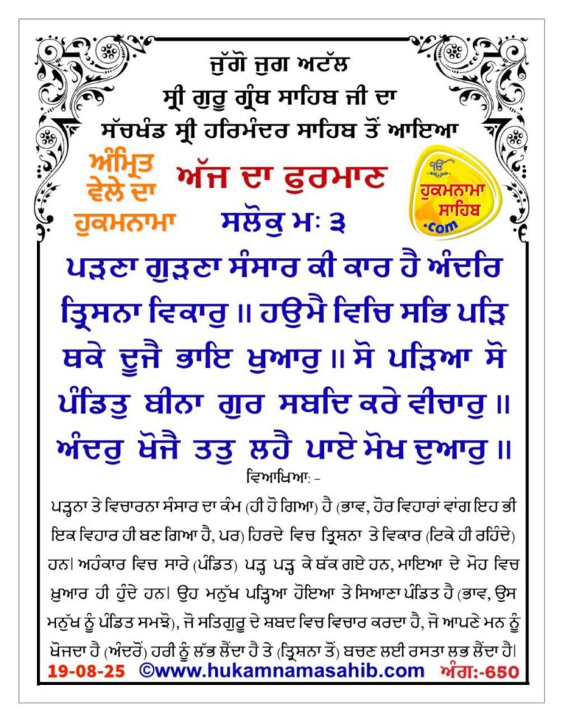 ਸੱਚਖੰਡ ਸ੍ਰੀ ਹਰਿਮੰਦਰ ਸਾਹਿਬ, ਸ੍ਰੀ ਅੰਮ੍ਰਿਤਸਰ, 19-08-2025