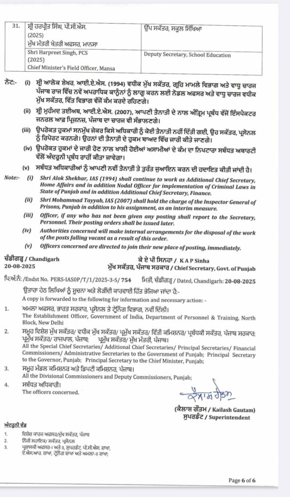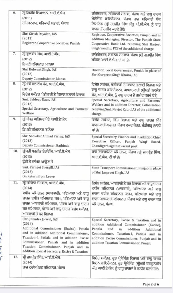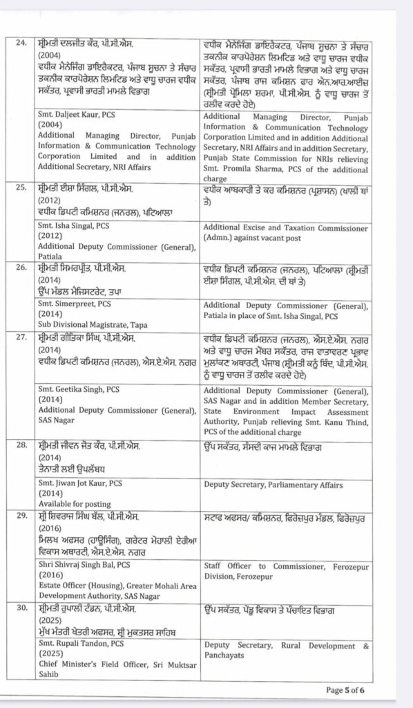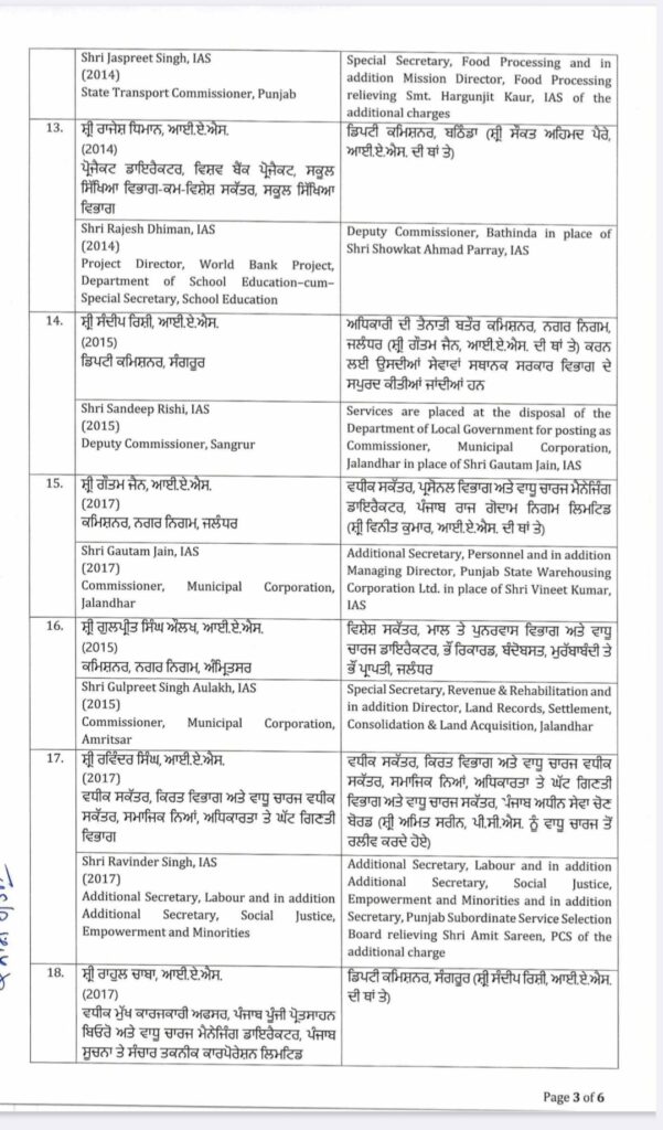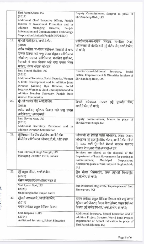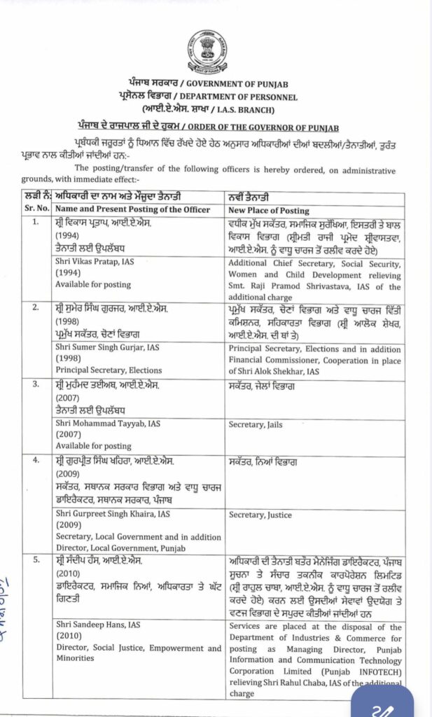 ਪੰਜਾਬ ਸਰਕਾਰ ਵੱਲੋਂ IAS ਤੇ PCS ਅਧਿਕਾਰੀਆਂ ਦੀਆਂ ਬਦਲੀਆਂ ਕੀਤੀਆਂ ਗਈਆਂ।