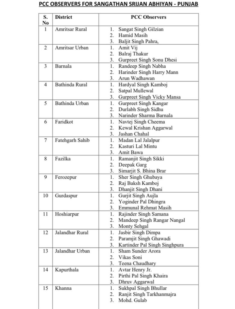 ਪੰਜਾਬ ’ਚ ਕਾਂਗਰਸ ਨੇ 29 ਜ਼ਿਲ੍ਹਿਆਂ ਵਿੱਚ ਲਗਾਏ 3-3 ਆਬਜਰਵਰ ਪੰਜਾਬ ਅਗਸਤ 24, 2025ਅਗਸਤ 24, 2025Leave a Comment on ਪੰਜਾਬ ’ਚ ਕਾਂਗਰਸ ਨੇ 29 ਜ਼ਿਲ੍ਹਿਆਂ ਵਿੱਚ ਲਗਾਏ 3-3 ਆਬਜਰਵਰ ਚੰਡੀਗੜ੍ਹ, 24 ਅਗਸਤ, ਦੇਸ਼ ਕਲਿੱਕ ਬਿਓਰੋ : ਕਾਂਗਰਸ ਵੱਲੋਂ ਪੰਜਾਬ ਵਿੱਚ ਪਾਰਟੀ ਨੂੰ ਮਜ਼ਬੂਤ ਕਰਨ ਲਈ 29 ਜ਼ਿਲ੍ਹਿਆਂ ਵਿੱਚ 3-3 ਆਬਜਰਵਰ ਲਗਾਏ ਹਨ। ਲਗਾਏ ਗਏ ਆਬਜਰਵਰਾਂ ਵਿੱਚ ਸਾਬਕਾ ਮੰਤਰੀ, ਵਿਧਾਇਕ, ਐਮਪੀ ਅਤੇ ਹੋਰ ਸੀਨੀਅਰ ਆਗੂ ਸ਼ਾਮਲ ਹਨ।